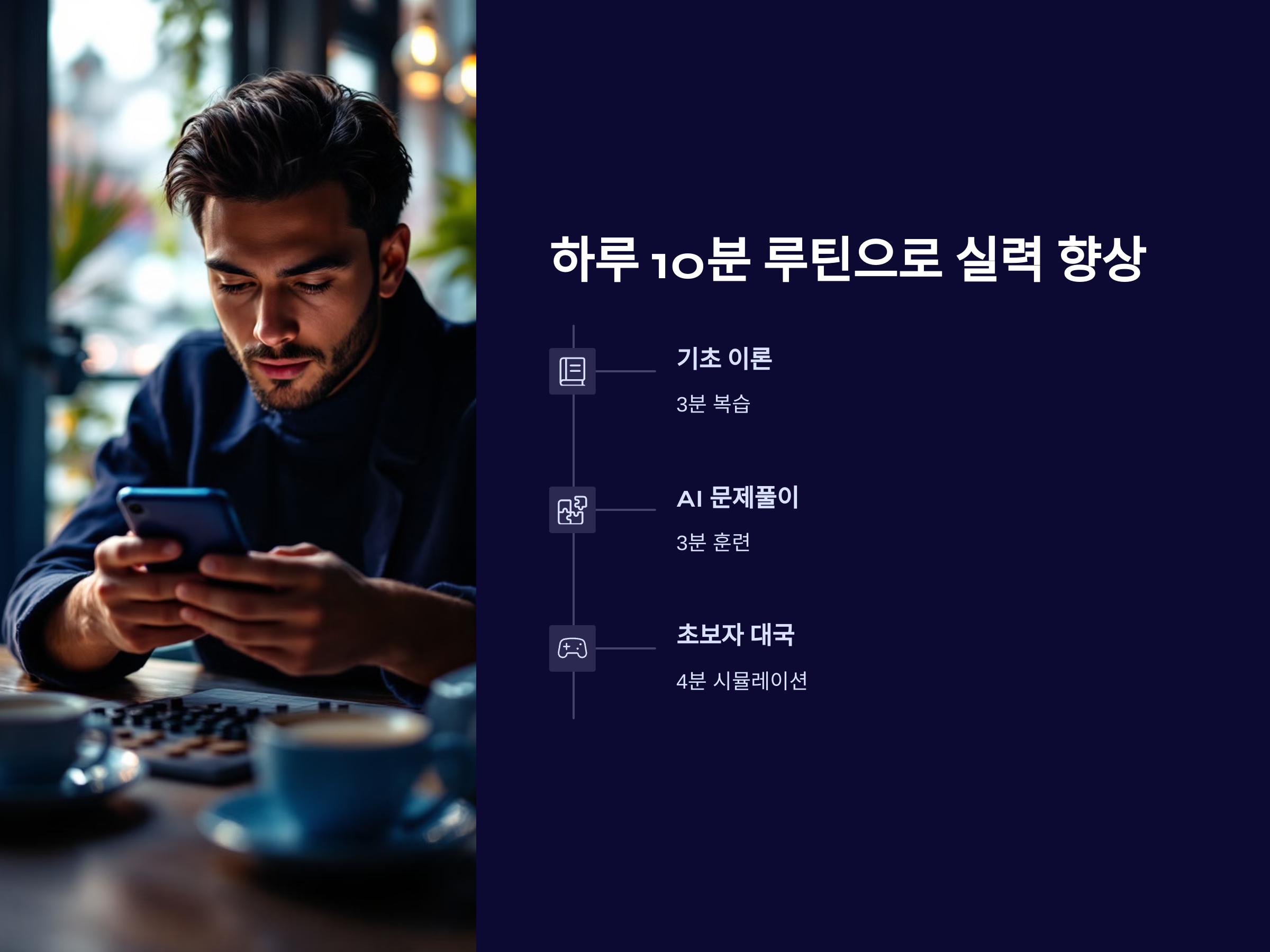 스마트폰으로 바둑을 배우는 데 가장 중요한 것은 ‘루틴’입니다. 하루에 10분만 투자해도 충분히 발전할 수 있으며, 짧은 시간이라도 매일 반복하는 것이 핵심입니다. 추천 루틴은 다음과 같습니다: ① 바둑 기초 이론 복습 3분, ② AI 문제풀이 3분, ③ 초보자 대국 시뮬레이션 4분. 이 루틴을 한 달만 지속해도 바둑의 전체 흐름을 이해하고, 간단한 포석 전략까지 익힐 수 있습니다.