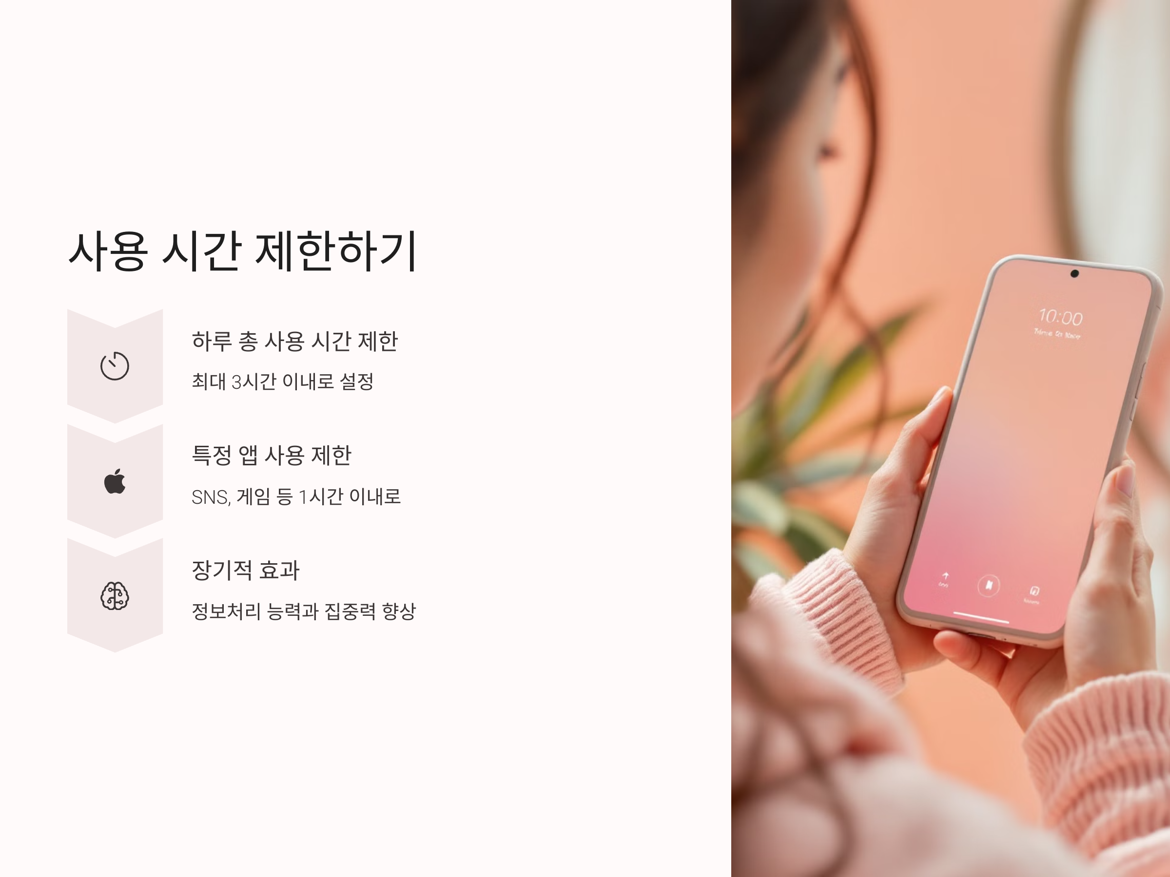 설정 앱이나 전용 타이머 앱을 활용해 하루 총 사용 시간을 제한해보세요. 하루 최대 3시간 이내, 혹은 특정 앱(예: SNS, 게임)은 하루 1시간 이내로 정하는 것도 좋은 방법입니다. 이러한 습관은 단기적으로는 불편할 수 있으나, 장기적으로는 뇌의 정보처리 능력과 집중력을 향상시키는 데 큰 도움이 됩니다.