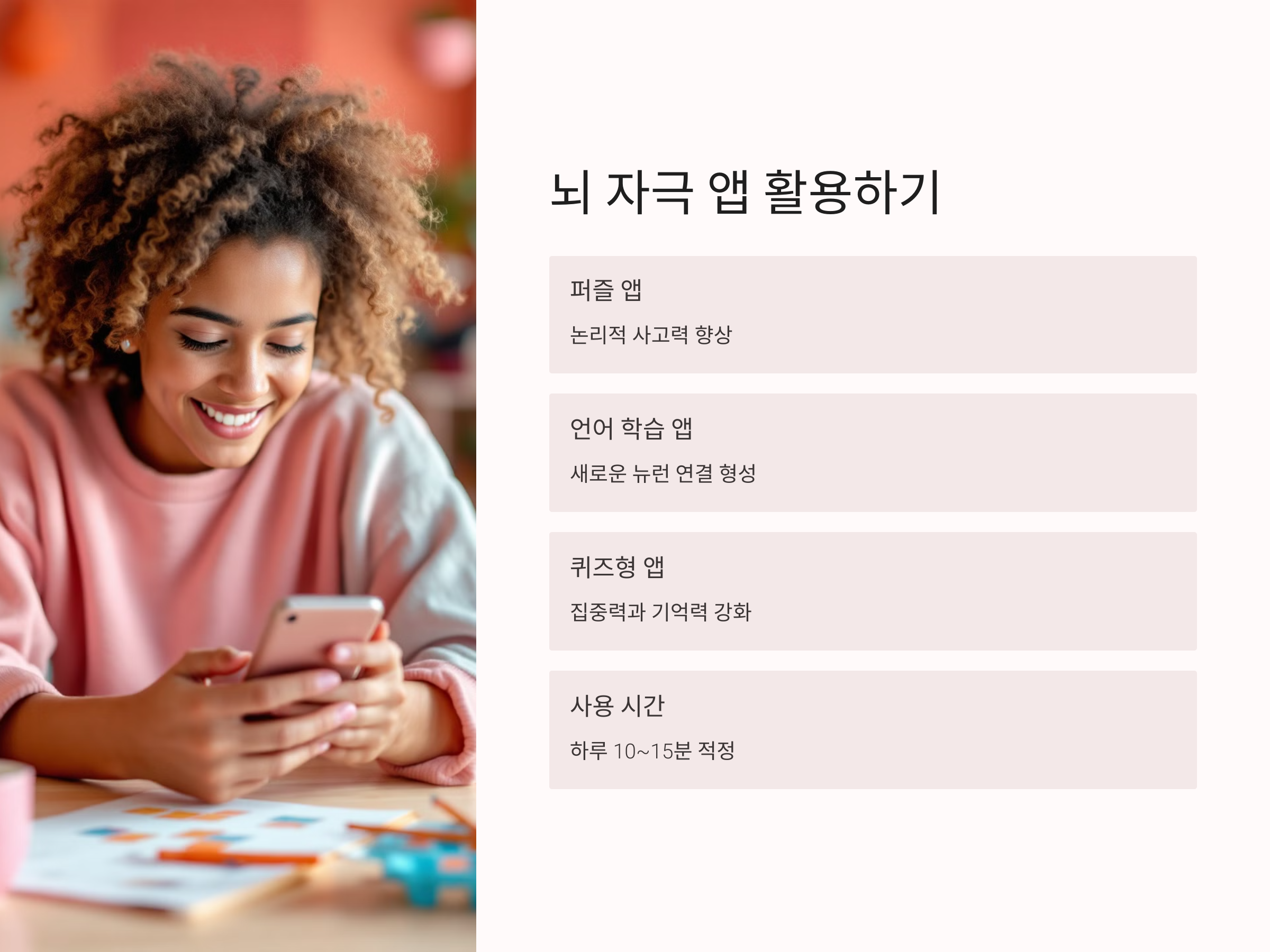 특히 고전적인 퍼즐 앱, 언어 학습 앱, 또는 짧은 시간 내 집중해야 하는 퀴즈형 앱은 사용자에게 몰입감을 주며 동시에 뇌를 건강하게 자극하는 데 효과적입니다. 단, 이들 앱의 사용도 ‘적정 시간’으로 제한하여 사용해야 합니다. 하루 10~15분 정도가 가장 이상적입니다.
