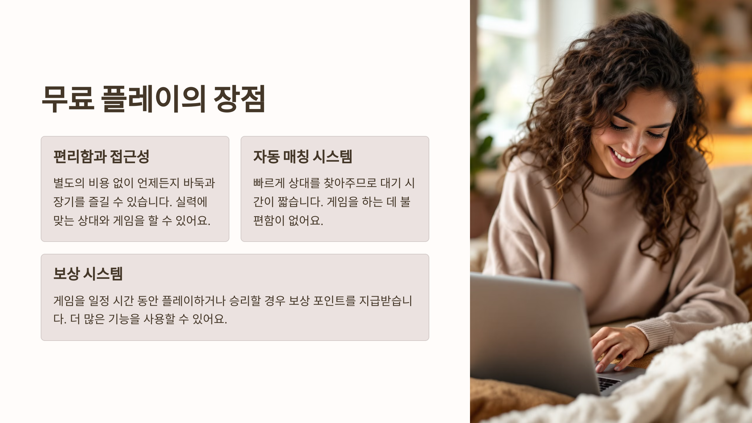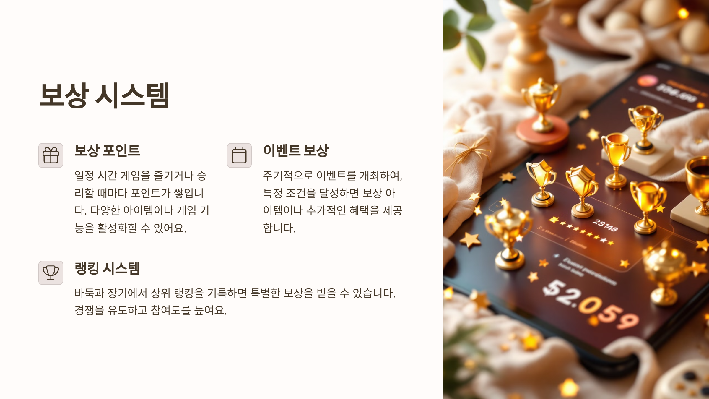 - A: 네, 게임에서 승리하거나 특정 조건을 달성하면 보상 포인트를 받을 수 있습니다. 이 포인트는 다양한 혜택으로 교환할 수 있습니다.