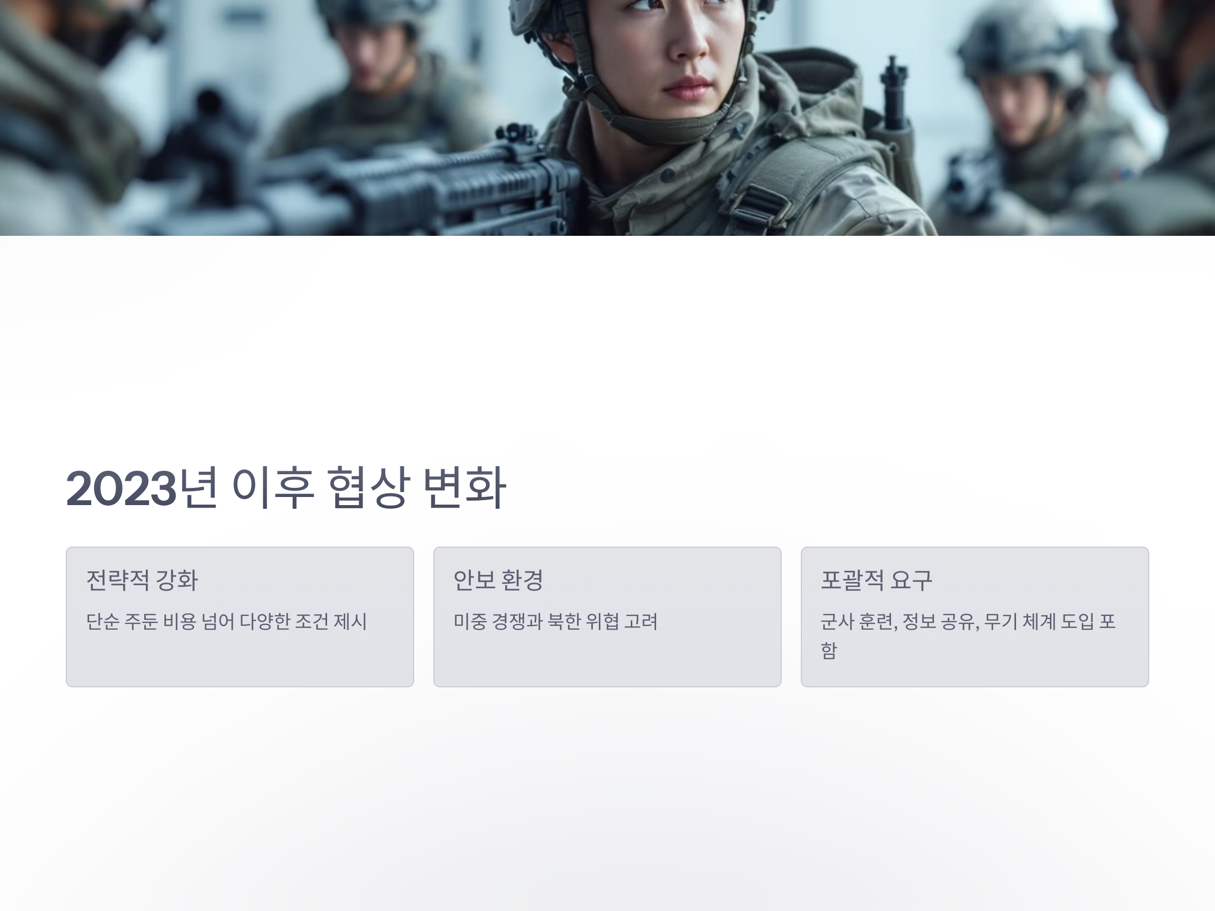 2023년 들어 한미 방위비 분담금 협상은 기존과 다른 양상을 보였습니다. 미국은 더 이상 단순히 미군 주둔 비용만을 요구하는 것이 아니라, 한미 동맹의 전략적 강화와 관련된 다양한 조건들을 제시하기 시작했습니다. 특히, 미중 경쟁과 북한의 위협을 염두에 두고, 방위비 분담금에 군사 훈련, 정보 공유, 최신 무기 체계 도입 등이 포함된 조건을 제시하고 있습니다.