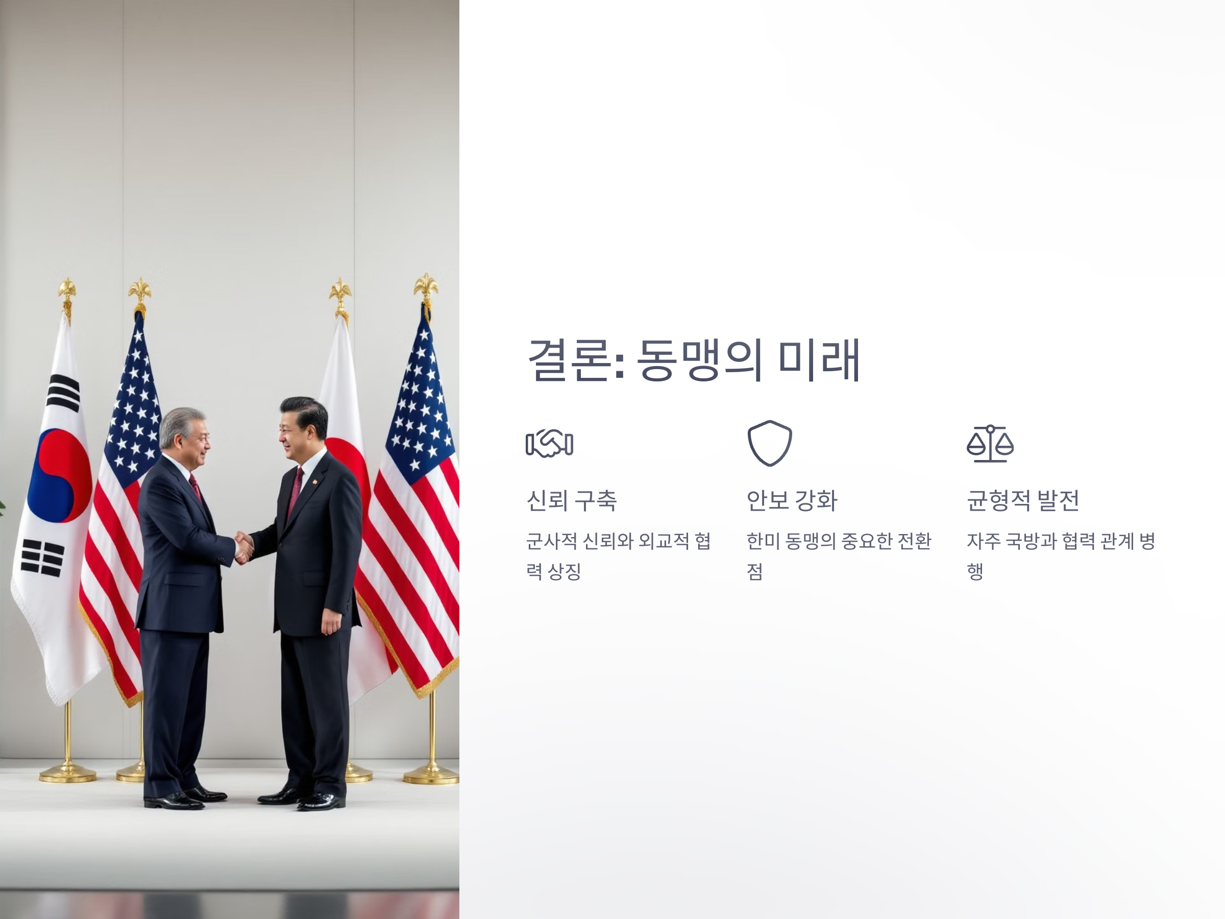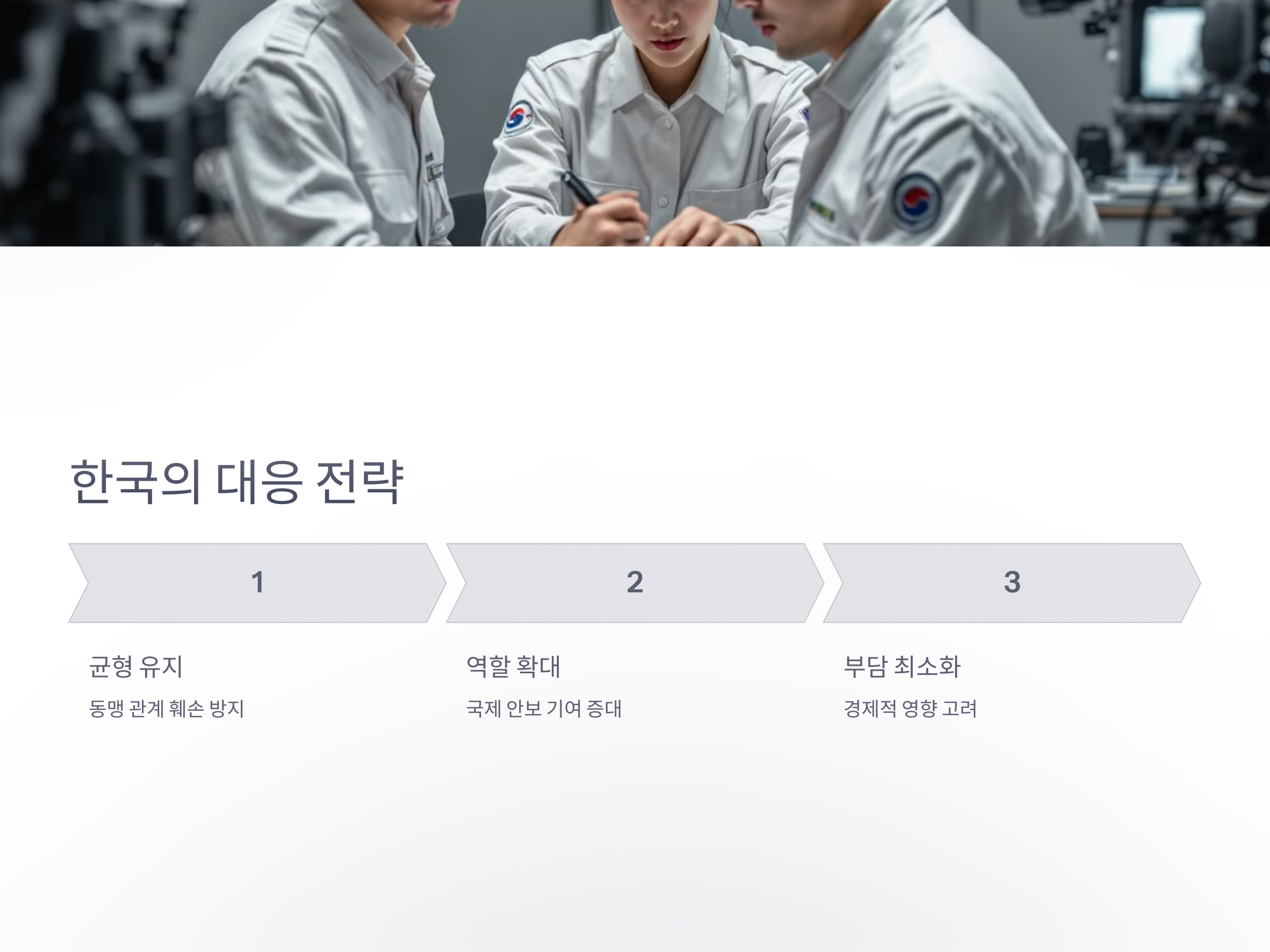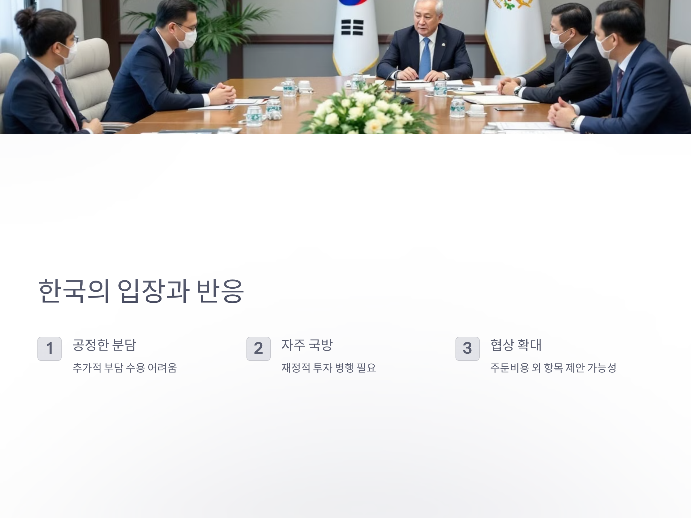 한국은 미국의 요구에 대해 직접적으로 거부하는 것은 자칫 한미 동맹에 악영향을 미칠 수 있기 때문에, 협상에서의 균형을 맞추는 데 주력하고 있습니다. 한국은 동맹 관계를 더욱 강화하고, 국제적인 안보 역할을 증대시키는 방향으로 협상에 나서고 있으며, 이를 통해 군사적 부담을 나누는 동시에, 경제적 부담을 최소화하려는 전략을 취하고 있습니다.