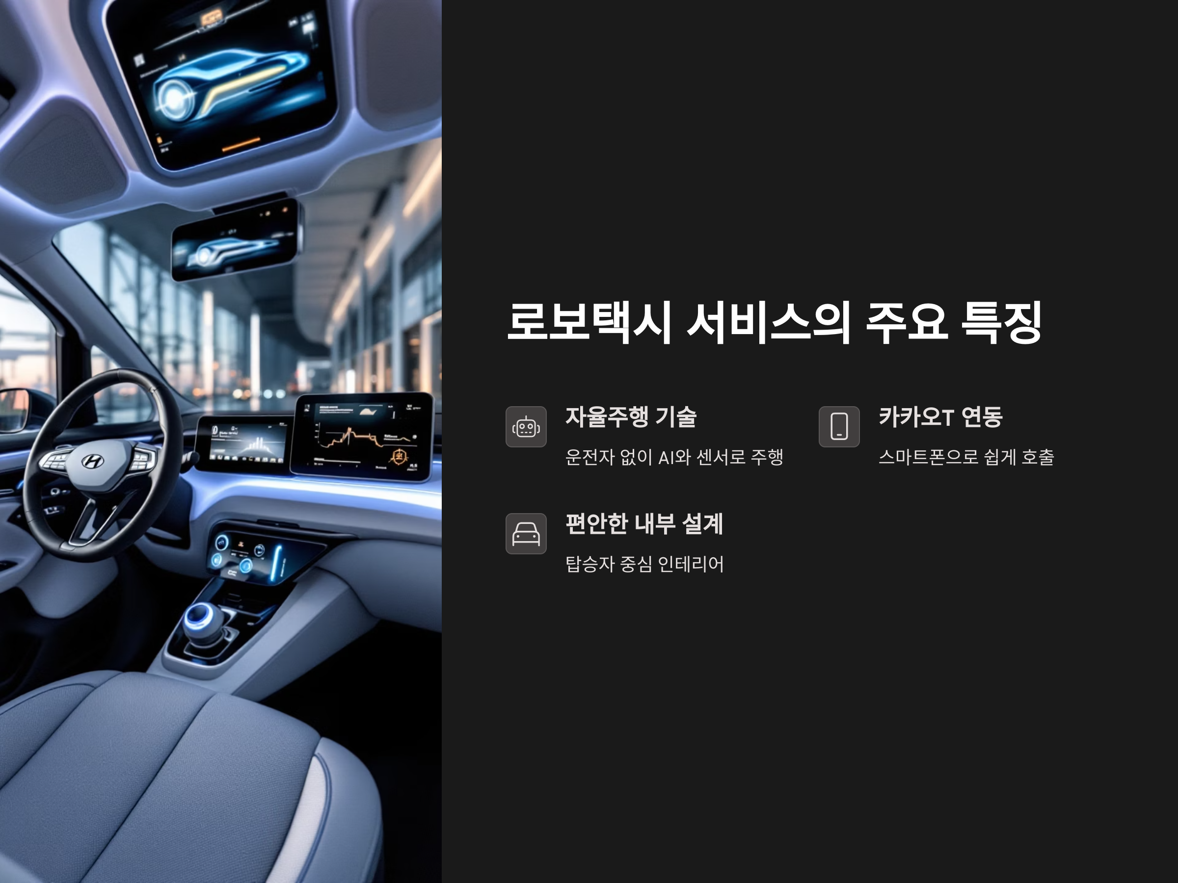 현대차의 로보택시 서비스는 기존의 택시와는 차별화된 여러 가지 특징을 가집니다. 우선, 자율주행 기술이 탑재되어 운전자가 필요하지 않다는 점이 가장 큰 차별점입니다. 이 차량들은 센서와 AI 시스템을 통해 주변 상황을 실시간으로 인식하고, 도로 상황에 맞게 안전하게 운전할 수 있습니다. 특히, 차량 내부는 탑승자가 편안하게 이용할 수 있도록 설계되었습니다.