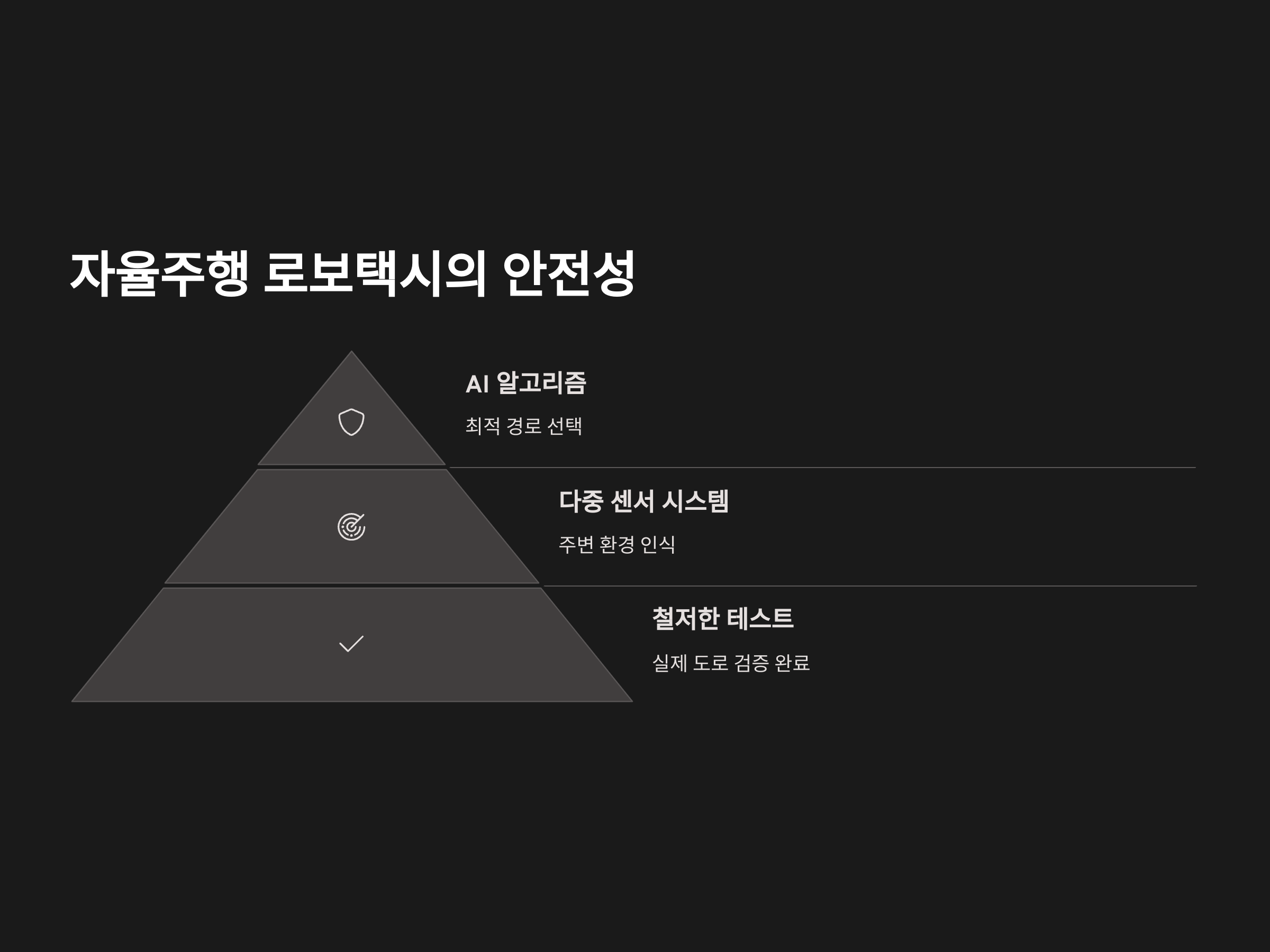 자율주행 기술이 많은 사람들에게 아직 낯설고 걱정스러울 수 있습니다. 하지만 현대차는 로보택시의 안전성에 최우선으로 신경을 썼습니다. 각 차량은 다수의 센서와 카메라, 레이더 등을 장착하여 주변 환경을 인식하고, AI 알고리즘을 통해 최적의 운전 경로를 선택합니다. 또한, 사고를 방지하기 위해 다양한 예방 시스템이 적용되어 있어, 사고 발생 가능성을 최소화할 수 있습니다.