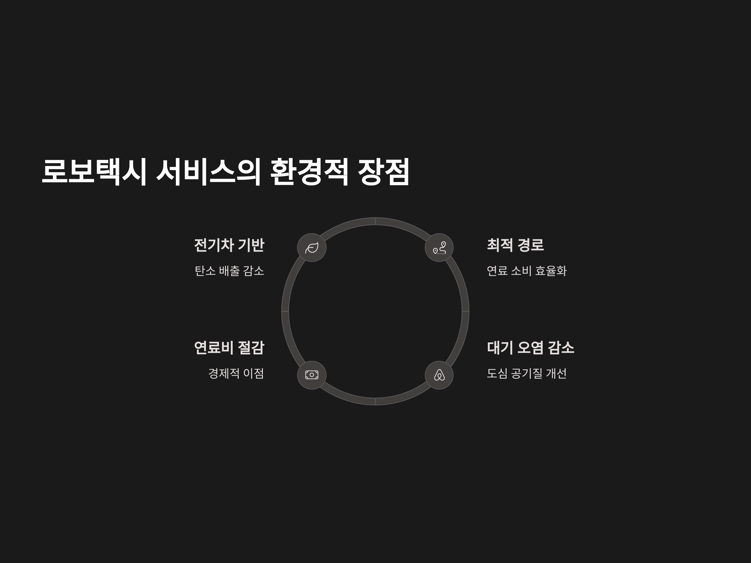 현대차의 로보택시 서비스는 환경 측면에서도 긍정적인 영향을 미칠 것으로 기대됩니다. 자율주행차는 대부분 전기차 기반으로 운영될 예정이며, 이는 탄소 배출을 줄이고, 대기 오염을 감소시키는 데 크게 기여할 것입니다. 전기차의 사용은 또한 연료비 절감에도 큰 영향을 미쳐, 더 효율적인 교통 시스템을 만들어낼 수 있습니다.