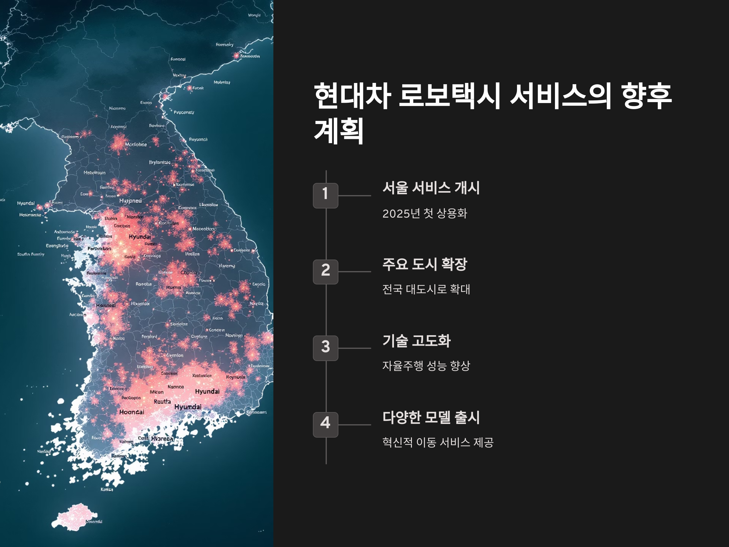 현대차는 로보택시 서비스를 시작으로, 자율주행 기술의 상용화를 위한 여러 가지 계획을 추진하고 있습니다. 이번 서비스는 첫 단계에 불과하며, 향후에는 더 넓은 지역으로 확대될 예정입니다. 또한, 자율주행차의 성능을 더욱 향상시키기 위해 지속적인 연구와 개발이 이루어질 것입니다.