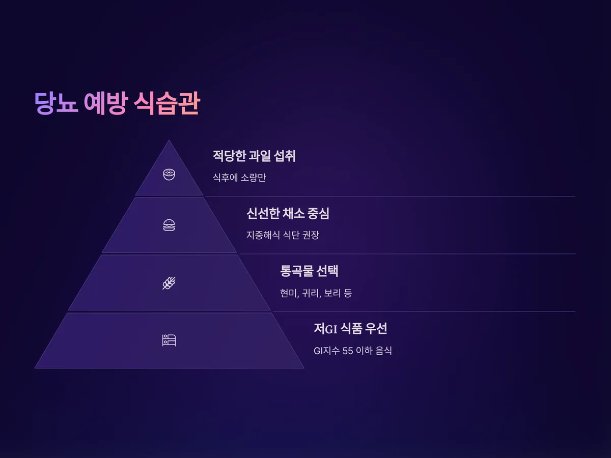 식습관은 당뇨 예방에 있어 가장 핵심적인 요소입니다. 특히 당지수가 낮은 음식 위주로 구성된 식단(GI지수 기준 55 이하)은 혈당 상승을 완만하게 만들어 인슐린 부담을 줄일 수 있습니다. 정제 탄수화물 섭취를 줄이고 현미, 귀리, 보리 등 식이섬유가 풍부한 곡류를 선택하는 것이 좋습니다.