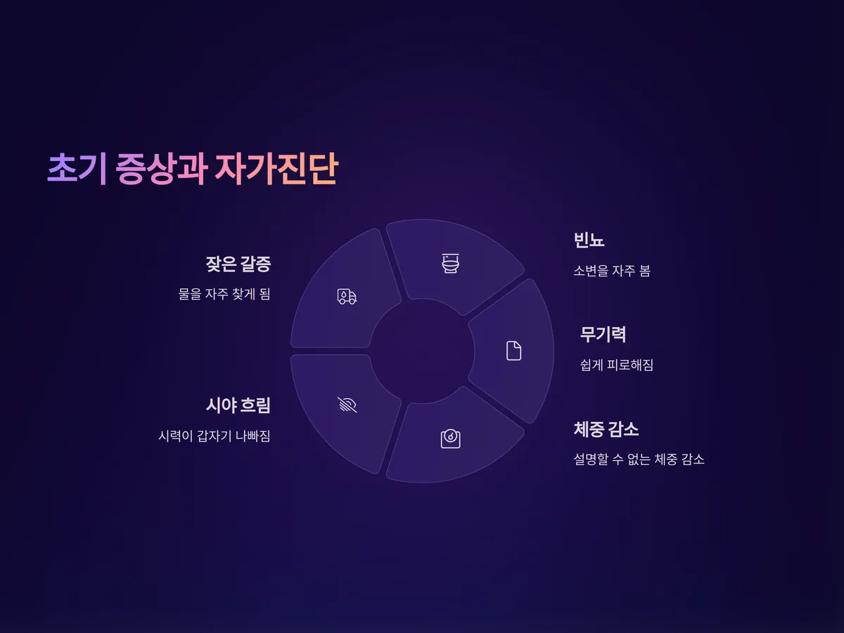 당뇨병의 초기 증상은 매우 미미하거나 전혀 자각하기 어려울 정도로 경미해서 조기 진단이 어렵습니다. 하지만 다음과 같은 증상이 지속된다면 당뇨병을 의심해볼 수 있습니다: 잦은 갈증, 빈뇨, 무기력, 체중 감소, 시야 흐림, 피부 건조, 감염에 대한 회복 지연 등입니다.