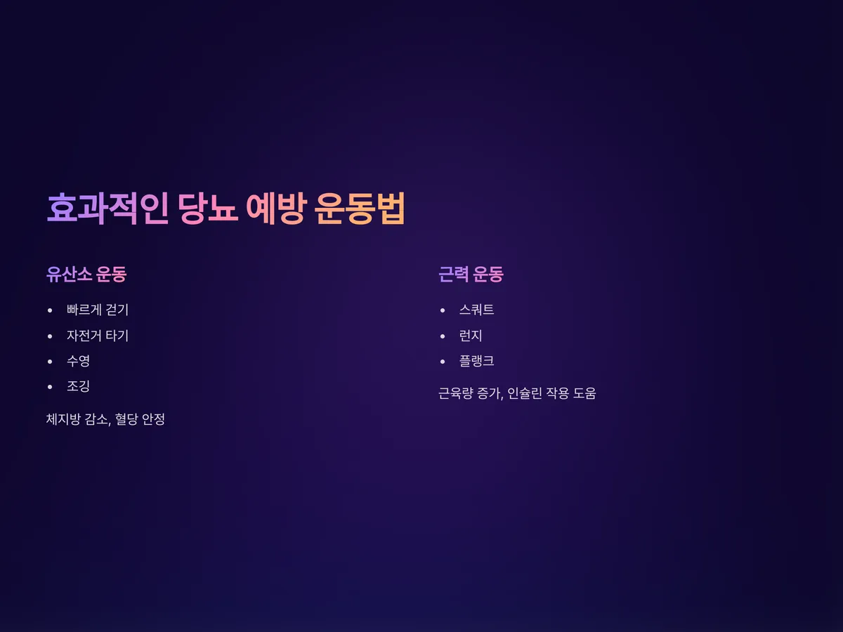 운동은 혈당을 낮추는 데 즉각적인 효과가 있으며, 장기적으로 인슐린 민감성을 개선하여 당뇨병 예방에 큰 도움이 됩니다. 유산소 운동과 근력 운동의 조합이 가장 이상적이며, 하루 30분 이상, 주 5회 이상 규칙적으로 실시하는 것이 중요합니다.