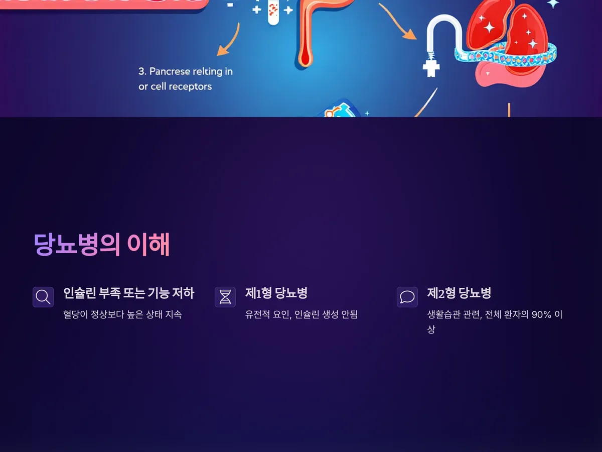 당뇨병은 인슐린의 분비량이 부족하거나 제대로 작용하지 않아 혈당이 정상보다 높은 상태가 지속되는 질환입니다. 대표적으로 제1형 당뇨병은 유전적 요인으로 인해 췌장에서 인슐린이 거의 생성되지 않는 형태이고, 제2형 당뇨병은 생활습관과 밀접한 관련이 있으며 전체 당뇨 환자의 약 90% 이상을 차지합니다.