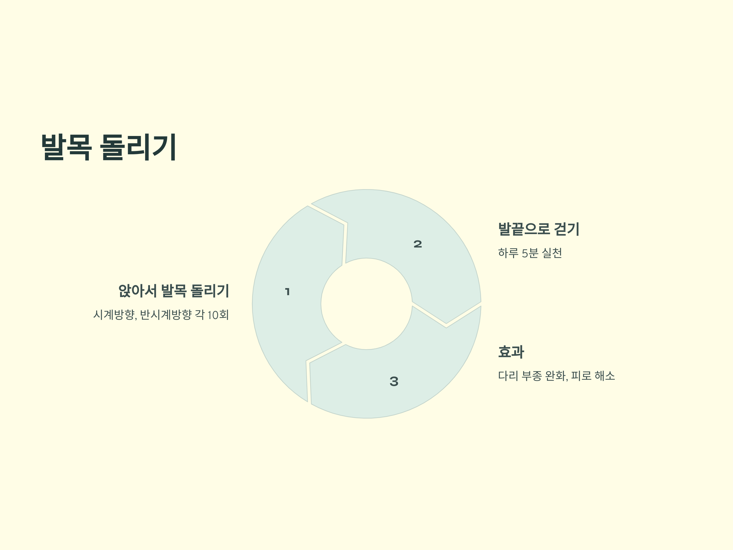 발목 돌리기는 혈액순환을 돕고, 특히 다리가 부종이 생기거나 피곤할 때 유용한 운동입니다. 간단한 동작이지만, 혈액순환을 촉진하는 데 큰 효과를 발휘합니다.