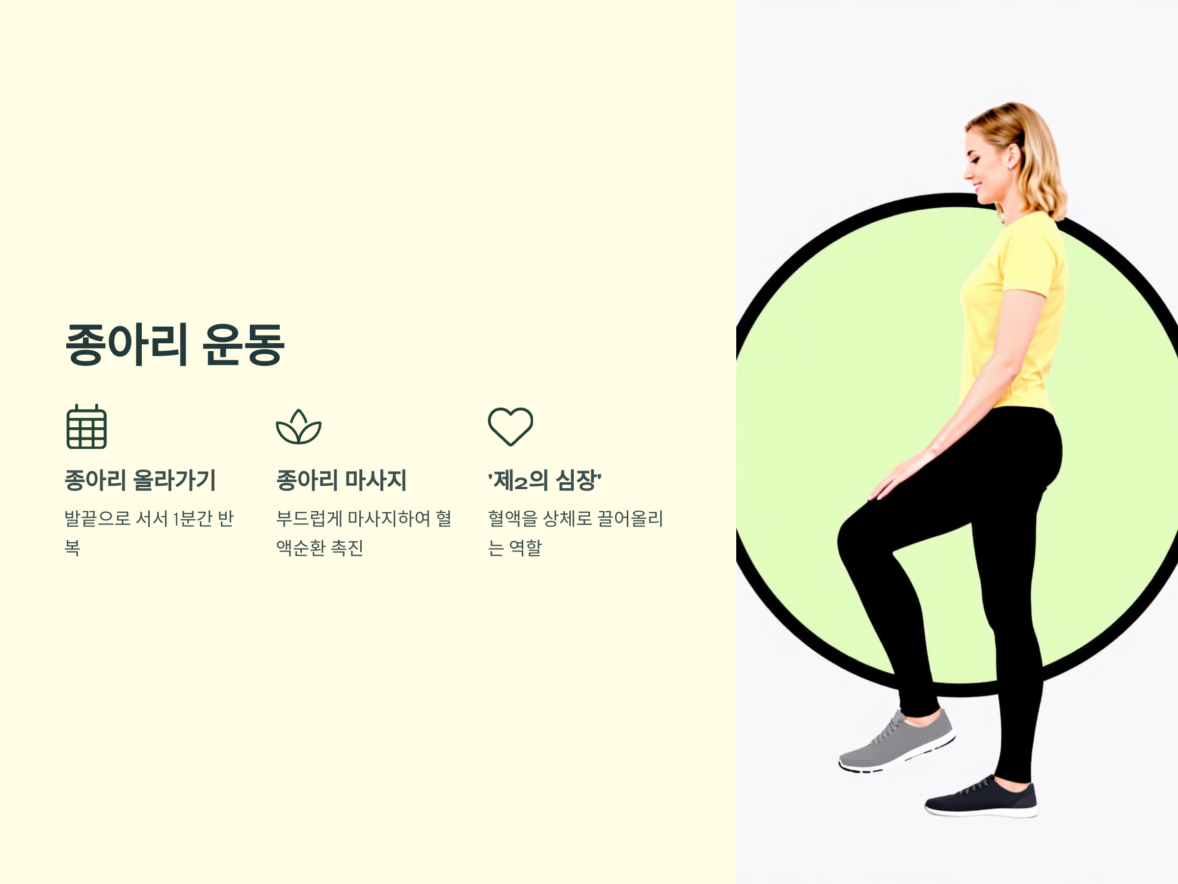 종아리 운동은 혈액순환에 직접적인 영향을 미칩니다. 종아리는 "제2의 심장"이라고 불리며, 혈액을 상체로 끌어올리는 역할을 합니다.