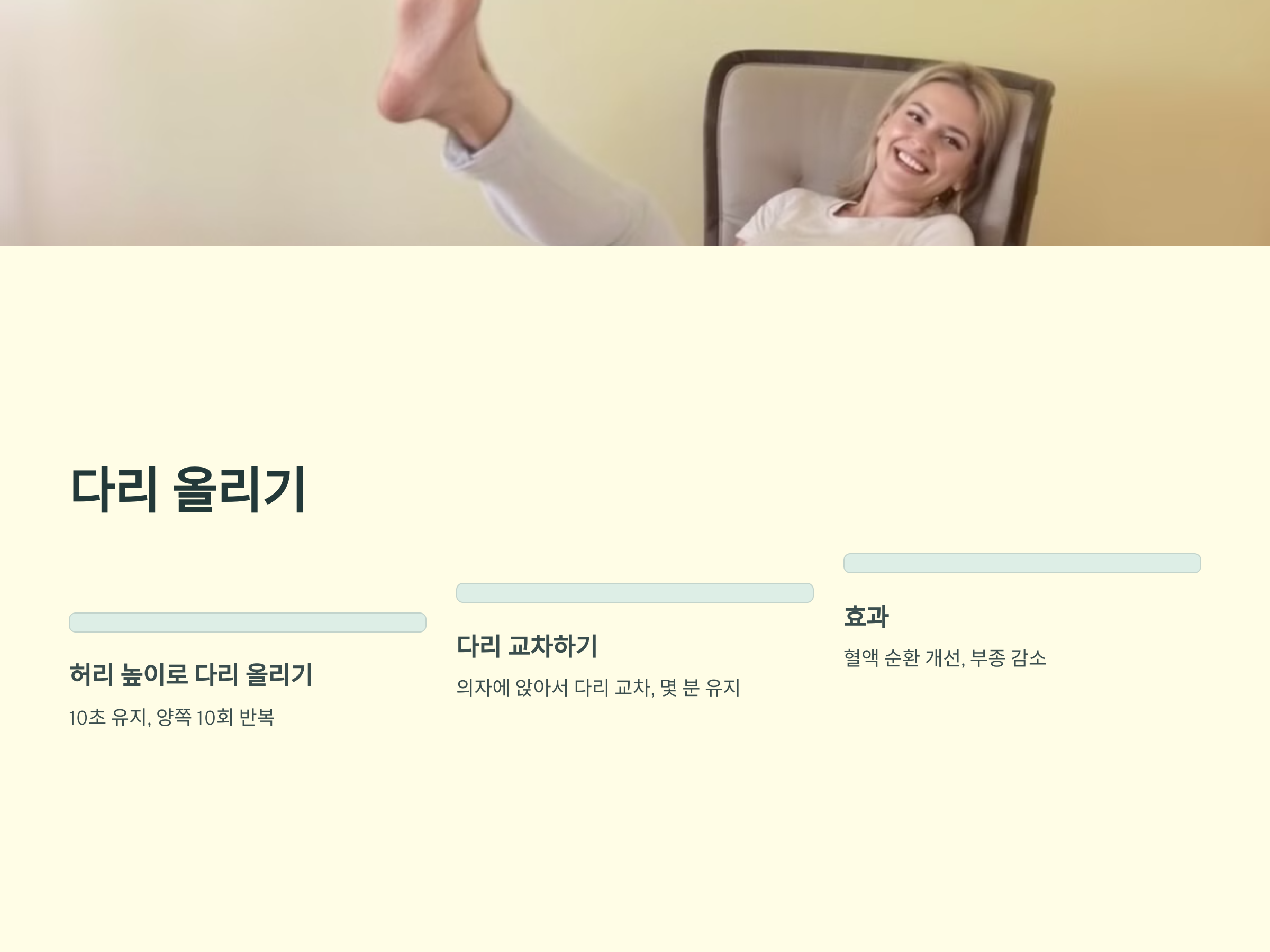 다리를 올려두는 것만으로도 혈액순환에 큰 도움이 됩니다. 특히 오랫동안 앉아있거나 서 있는 직장인에게 추천하는 운동입니다.