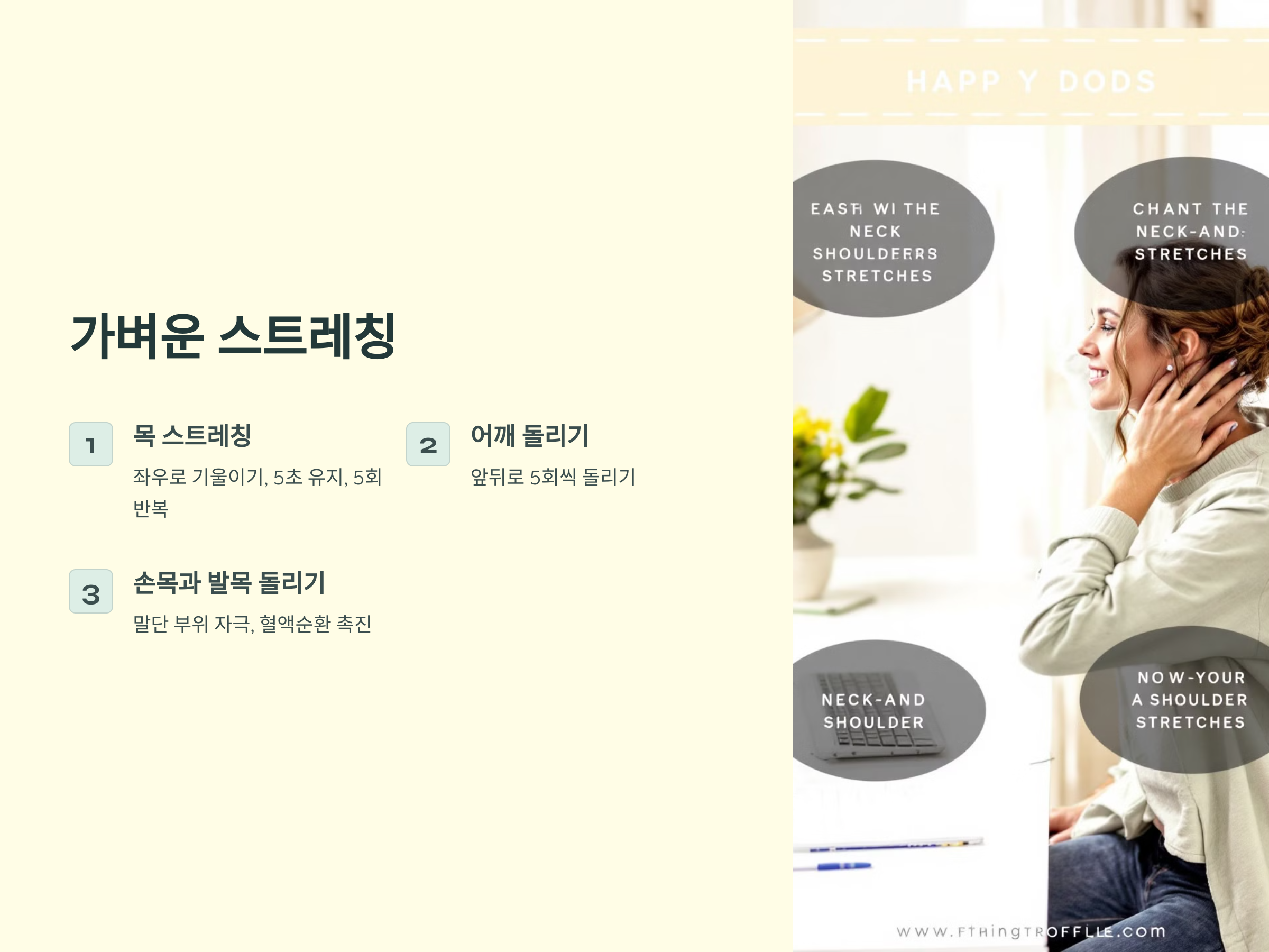 - 목 스트레칭: 목을 좌우로 천천히 기울이면서, 5초간 유지한 후 반대편으로 기울입니다. 이 동작을 5회 반복합니다.