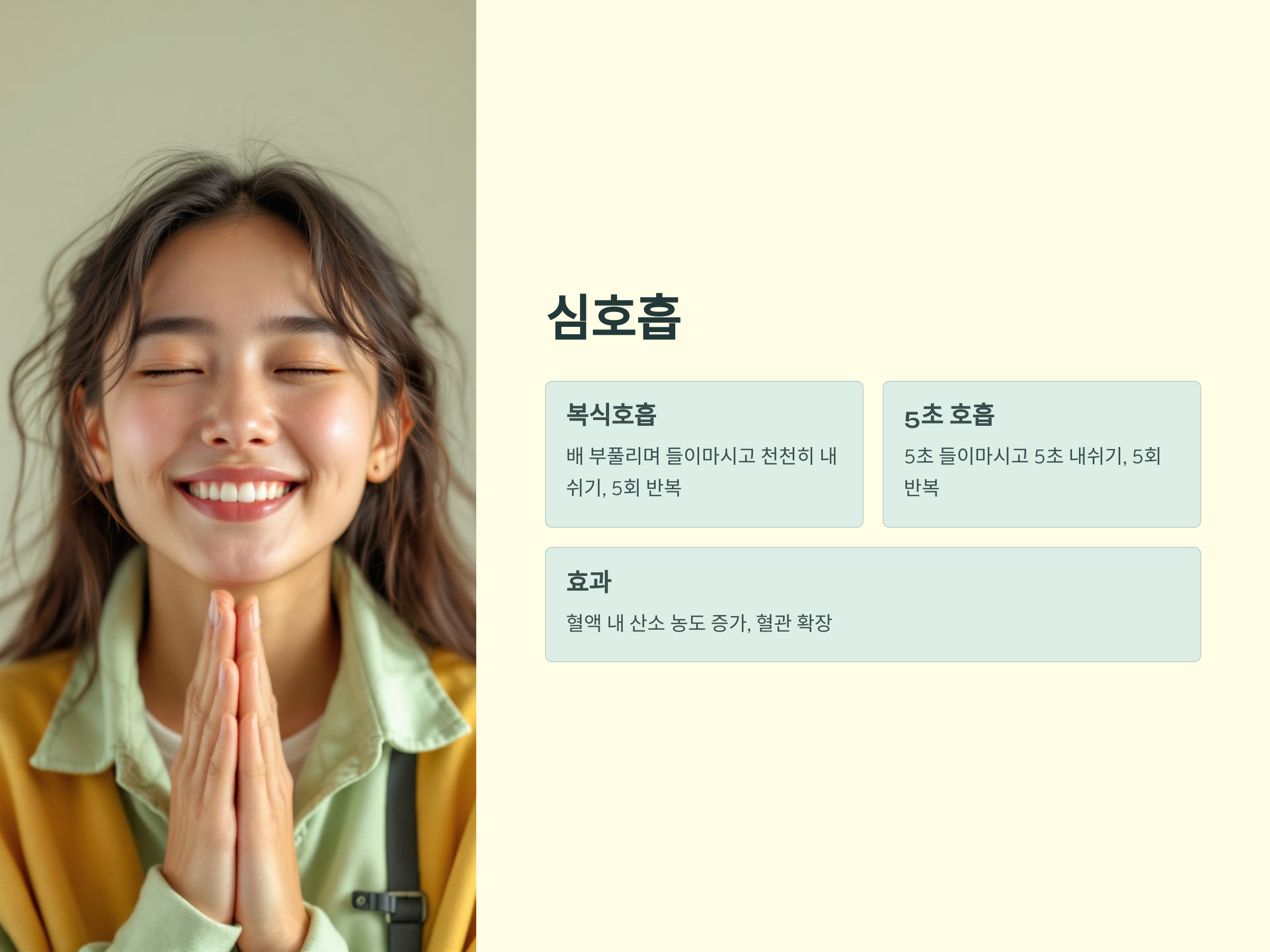 심호흡은 스트레스를 완화시킬 뿐만 아니라, 혈액순환을 촉진하는 데 매우 중요한 역할을 합니다. 깊은 호흡을 통해 혈액 내 산소 농도를 높여주고, 혈관을 확장시키는 효과가 있습니다.