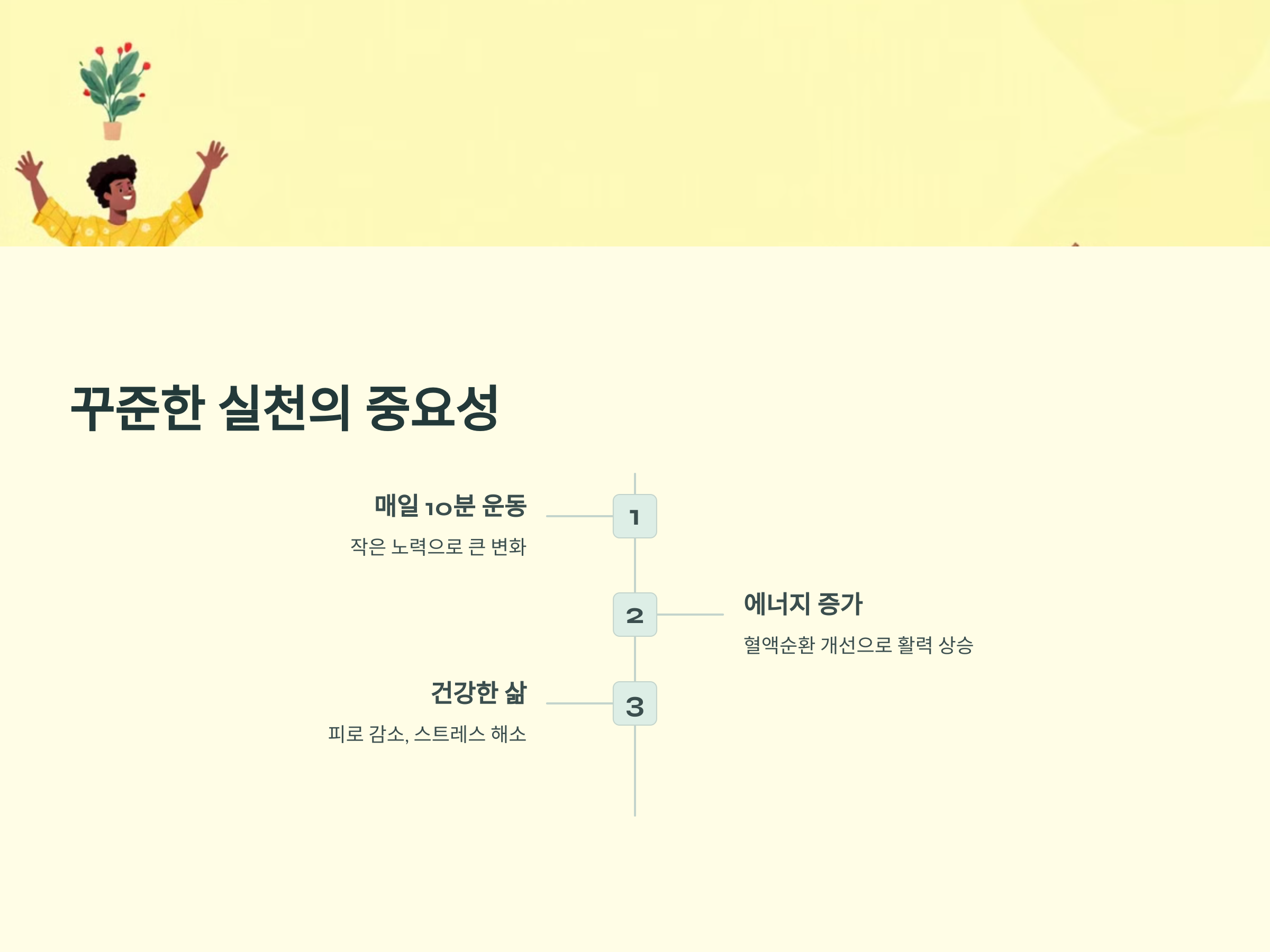 매일 10분씩이라도 운동을 실천해 보세요. 혈액순환이 좋아지면 에너지가 넘치고, 몸의 피로도 덜할 것입니다. 작은 노력으로 건강을 지킬 수 있으니, 오늘부터 실천해보세요!