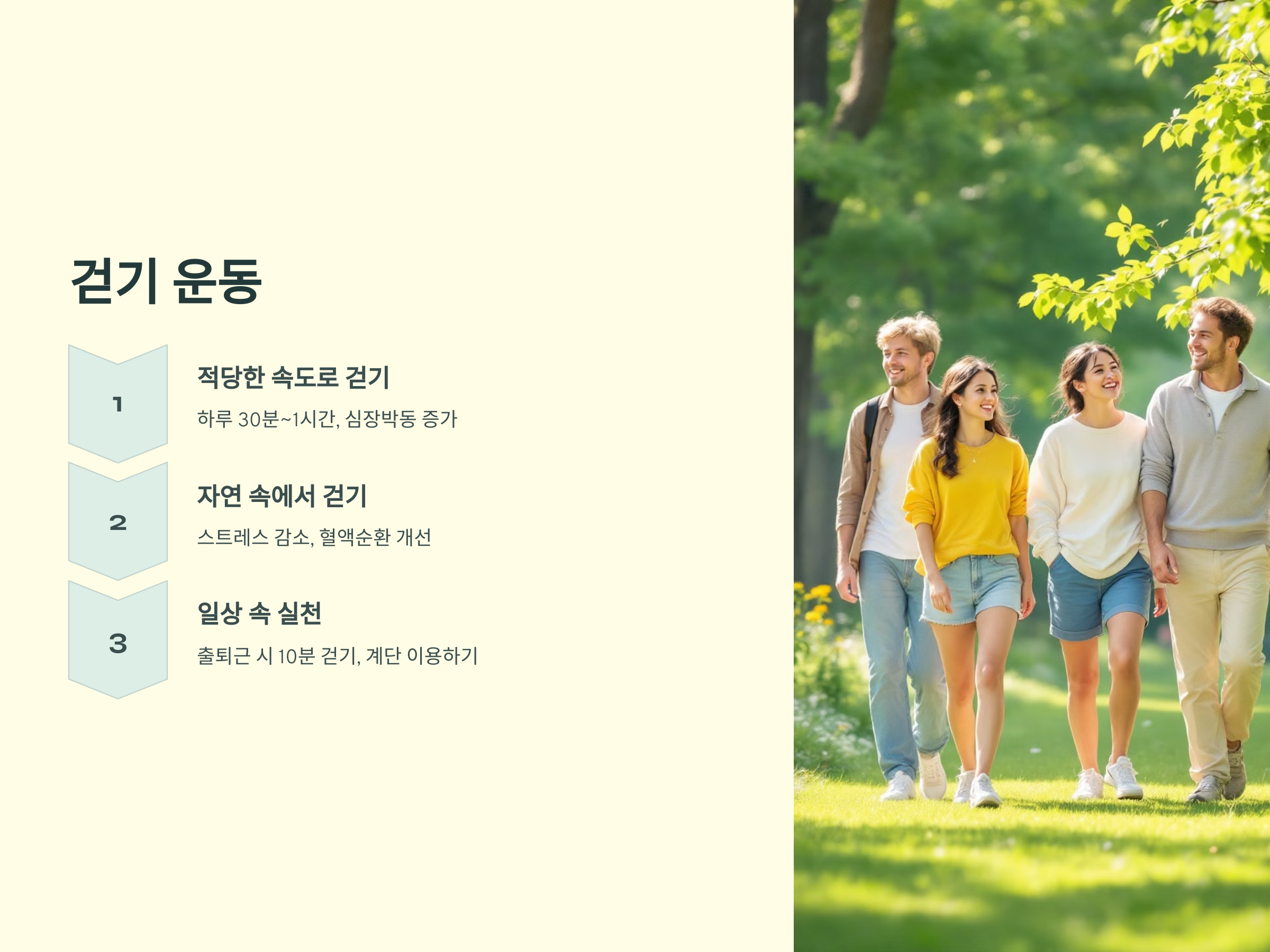 - 적당한 속도로 걷기: 하루 30분에서 1시간 정도, 적당한 속도로 걷는 것만으로도 혈액순환에 큰 도움이 됩니다. 자주 걷기 어려운 환경이라면, 출퇴근 시 10분씩 걷거나 엘리베이터 대신 계단을 이용해 보세요.