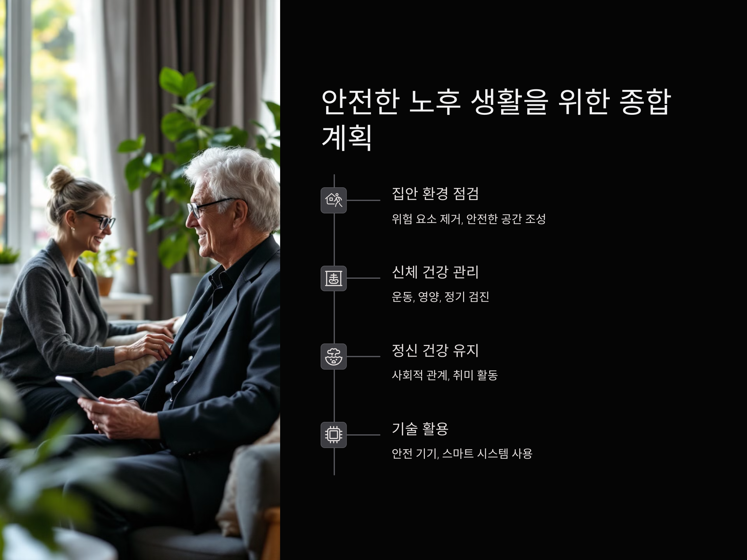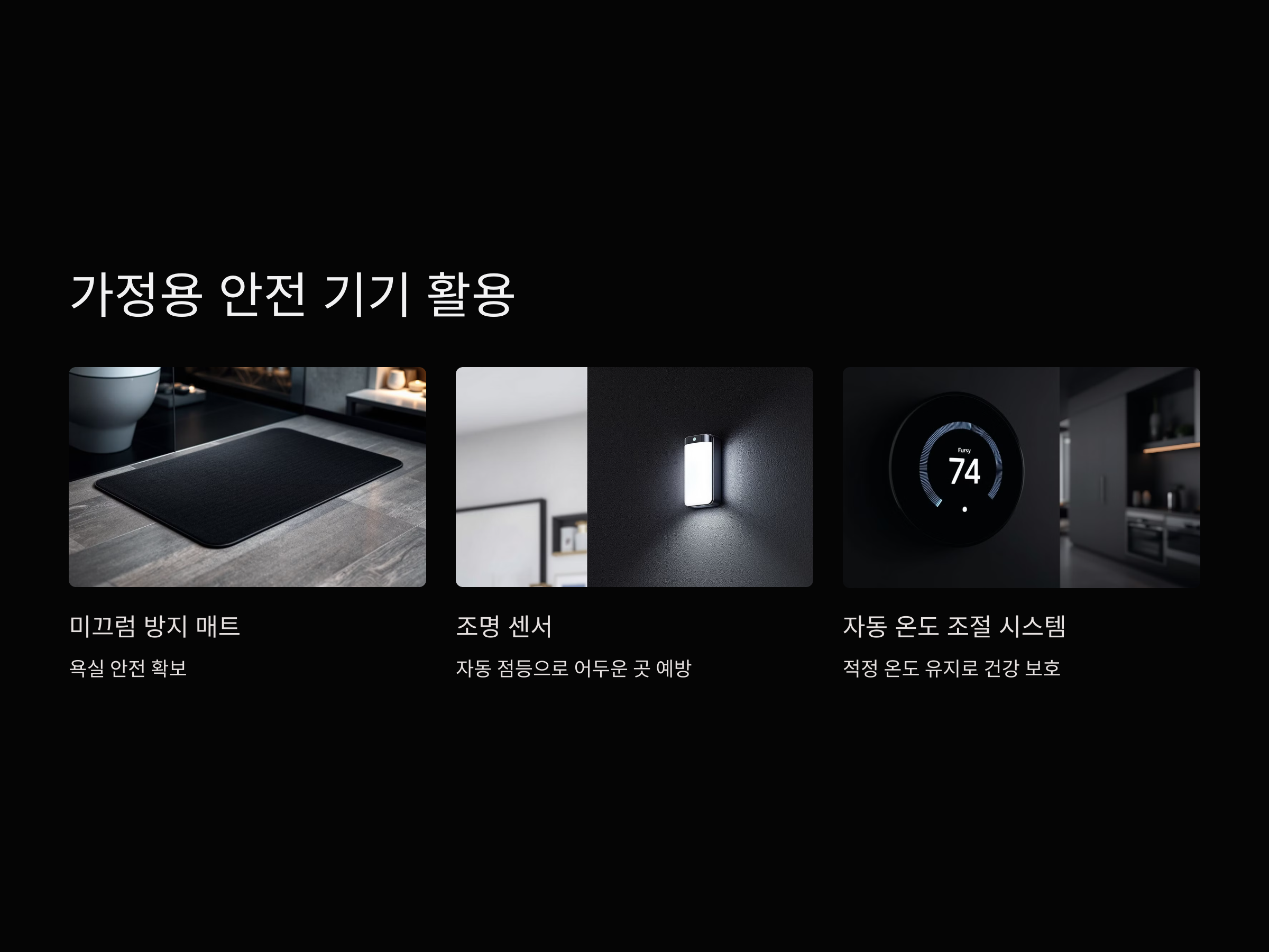 혼자 사는 노인들이 안전하게 생활하려면 다양한 가정용 안전 기기들을 활용하는 것이 좋습니다. 예를 들어, 미끄럼 방지 매트, 조명 센서, 자동 온도 조절 시스템 등을 사용하여 생활 환경을 보다 안전하게 만들 수 있습니다. 또한, 스마트폰이나 스마트 기기를 이용해 가정 내 여러 기기들을 자동으로 제어하거나, 알림을 받을 수 있도록 설정하는 것도 도움이 됩니다. 이러한 안전 기기들을 잘 활용하면 사고를 예방하고 더 안전한 환경을 유지할 수 있습니다.
