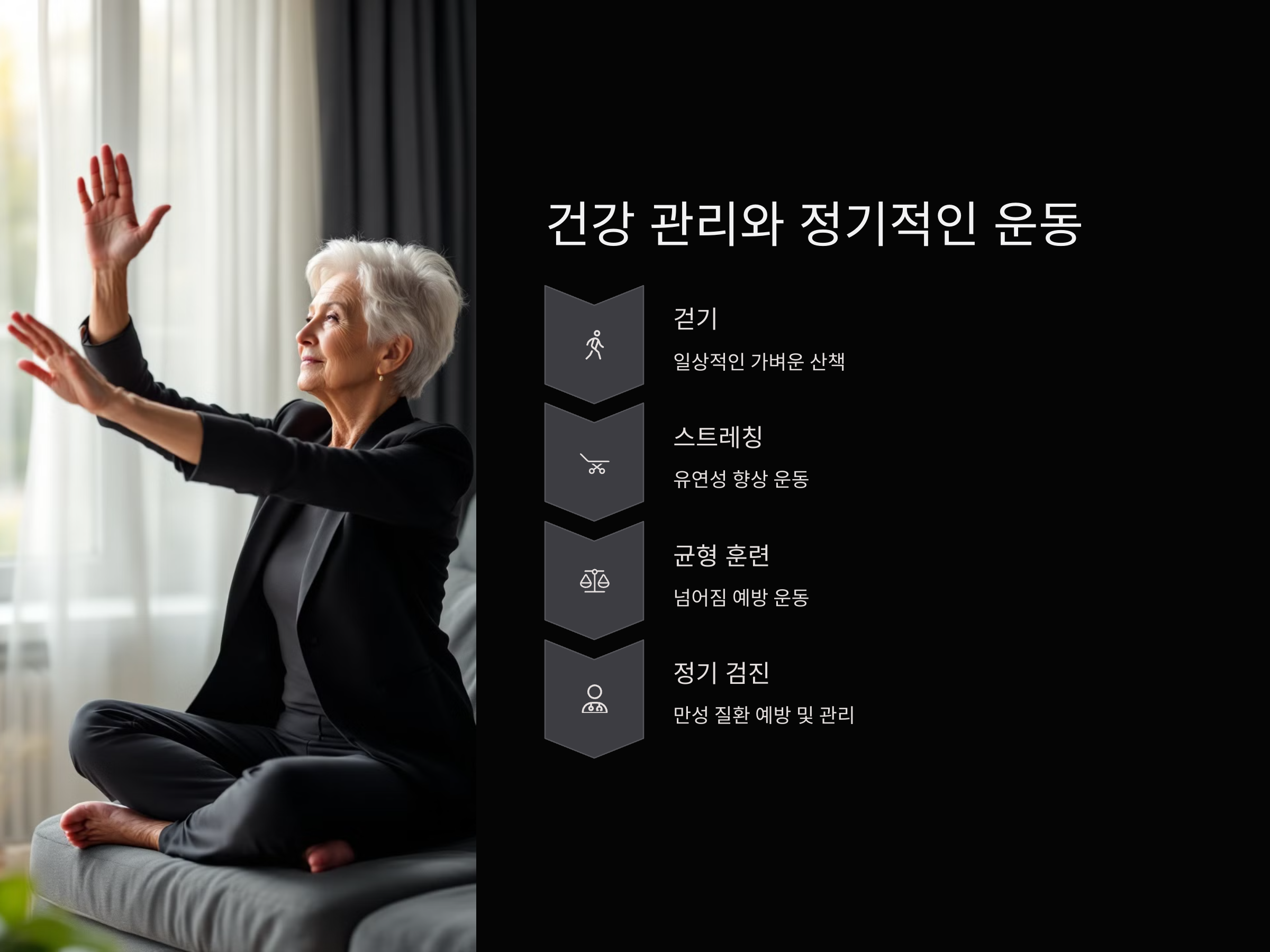 건강 관리는 노인들에게 매우 중요합니다. 혼자 생활하는 노인들이 자주 겪는 문제 중 하나는 건강이 나빠지면서 의존적인 생활로 전환되는 것입니다. 이를 예방하기 위해서는 꾸준한 건강 관리와 가벼운 운동이 필요합니다. 특히 걷기, 스트레칭, 균형 훈련 등을 통해 넘어지지 않도록 하는 것이 중요합니다. 이를 위해, 집에서 할 수 있는 운동을 시작하거나, 지역 사회의 운동 프로그램에 참여하는 것이 좋습니다. 또한, 주기적인 건강 검진을 통해 만성 질환을 예방하고 관리하는 것도 필수적입니다.