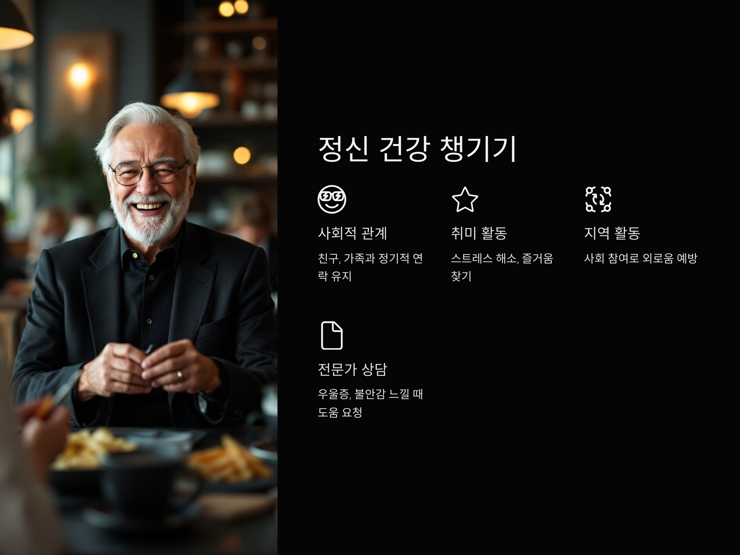 정신 건강은 신체 건강만큼 중요합니다. 혼자 사는 노인들은 외로움과 우울감을 느낄 수 있기 때문에, 이를 예방하고 관리하는 것이 필수적입니다. 정기적으로 친구나 가족과 연락을 유지하거나, 지역 사회 활동에 참여하여 사회적 관계를 강화하는 것이 중요합니다. 또한, 취미 활동을 통해 스트레스를 해소하고, 긍정적인 마음가짐을 유지하는 것이 정신 건강에 좋습니다. 만약 우울증이나 불안감을 느낀다면, 전문가의 상담을 받는 것도 좋은 방법입니다.