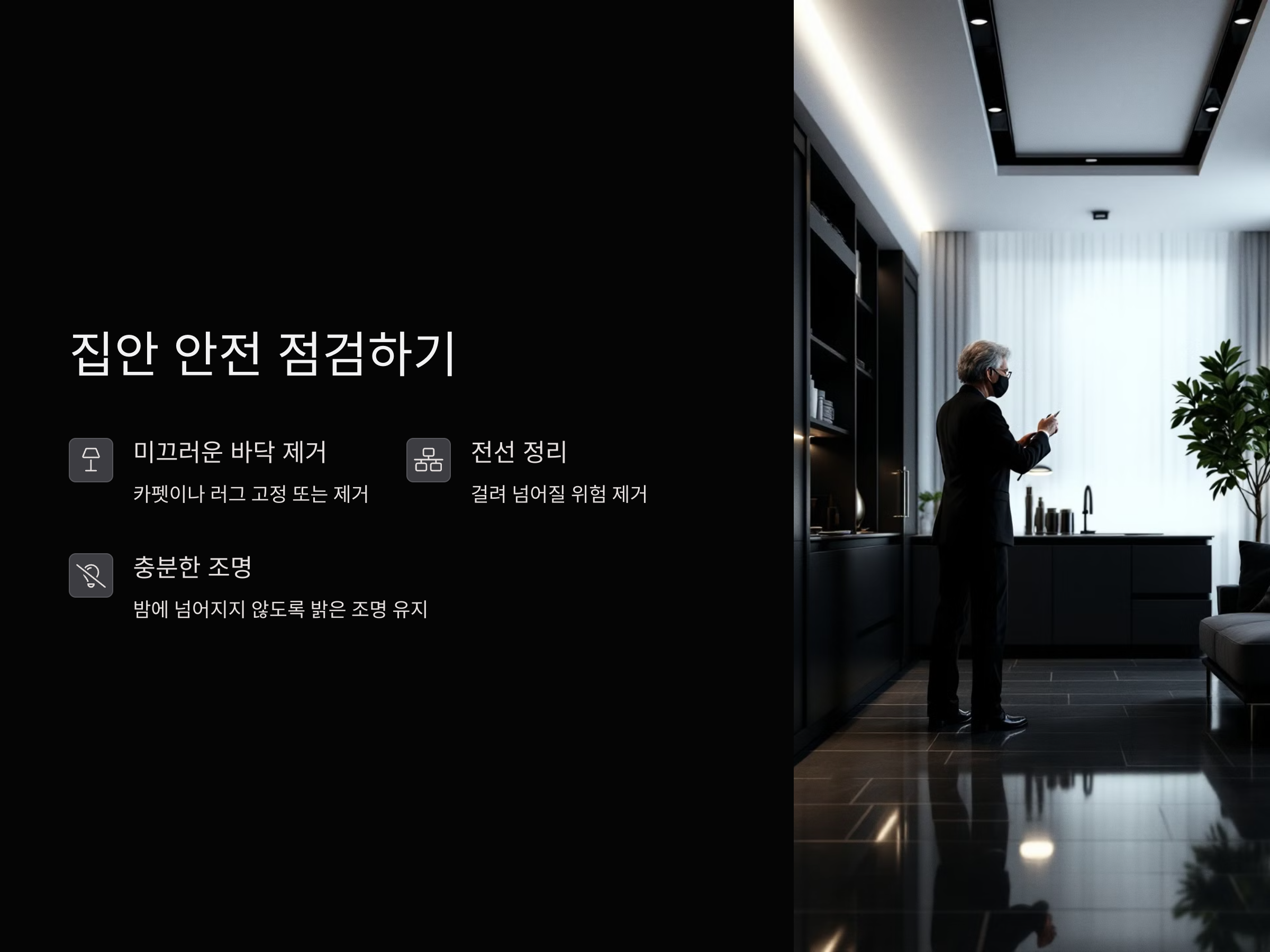 혼자 사는 노인들에게 가장 중요한 것은 바로 집안 환경의 안전입니다. 일상적으로 자주 사용하는 공간에서 사고가 발생할 수 있기 때문에, 주기적으로 집안을 점검하고 위험 요소를 제거하는 것이 중요합니다. 우선, 미끄러운 바닥이나 길을 막고 있는 장애물을 제거해야 합니다. 카펫이나 러그는 쉽게 미끄러지기 때문에 붙여놓거나 제거하는 것이 좋습니다. 또한, 전선이 걸려 있는 곳을 정리하고, 조명이 충분히 밝은지 확인해 밤에 넘어지지 않도록 주의해야 합니다.