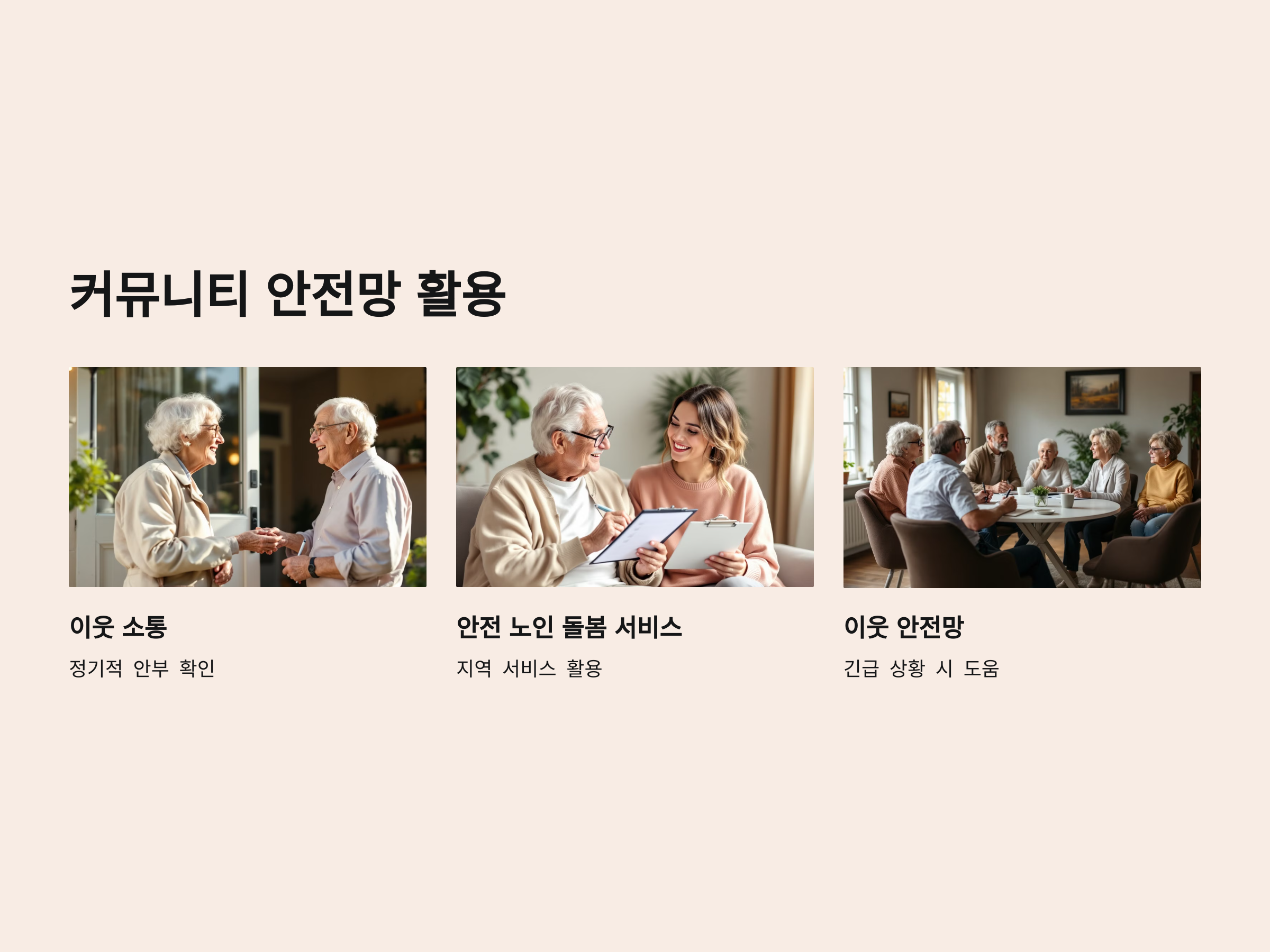 이 외에도, 일부 지역에서는 ‘안전 노인 돌봄 서비스’나 ‘이웃 안전망’을 운영하여 혼자 사는 노인들이 사고나 범죄의 위협에서 벗어날 수 있도록 돕고 있습니다. 이 서비스를 통해 긴급 상황 시 빠르게 도움을 받을 수 있으며, 지역 사회의 협력을 통해 더욱 안전한 생활을 할 수 있습니다.