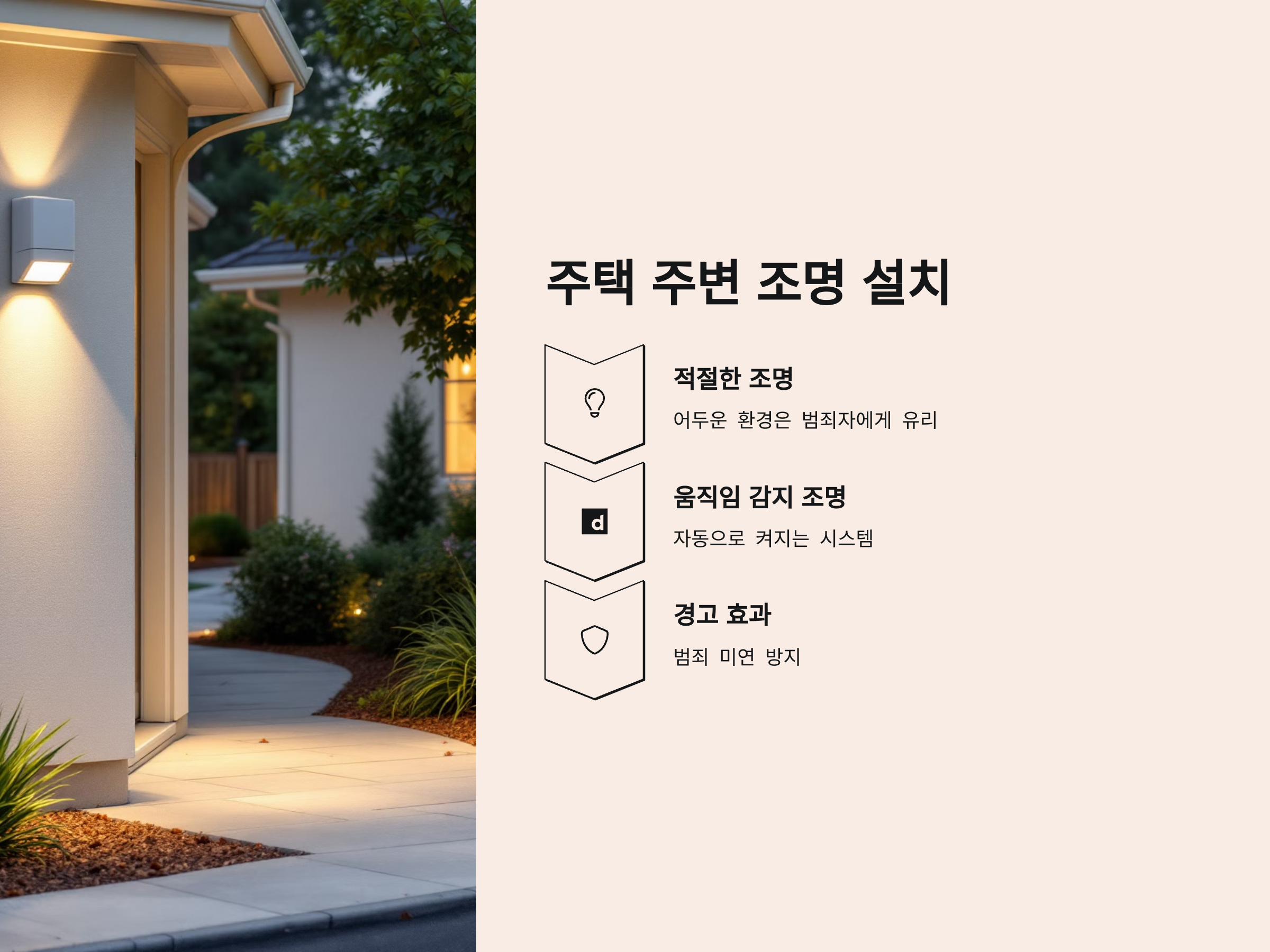 어두운 환경은 범죄자들에게 매우 유리한 조건을 제공합니다. 그래서 집 주변에 적절한 조명을 설치하는 것은 보안 강화를 위해 매우 중요합니다. 주택의 입구나 주차장, 정원 등 어두운 곳에 충분한 조명을 설치하면 외부인이 접근하기 어렵고, 침입을 시도하는 사람이 있다면 그들을 쉽게 식별할 수 있습니다.