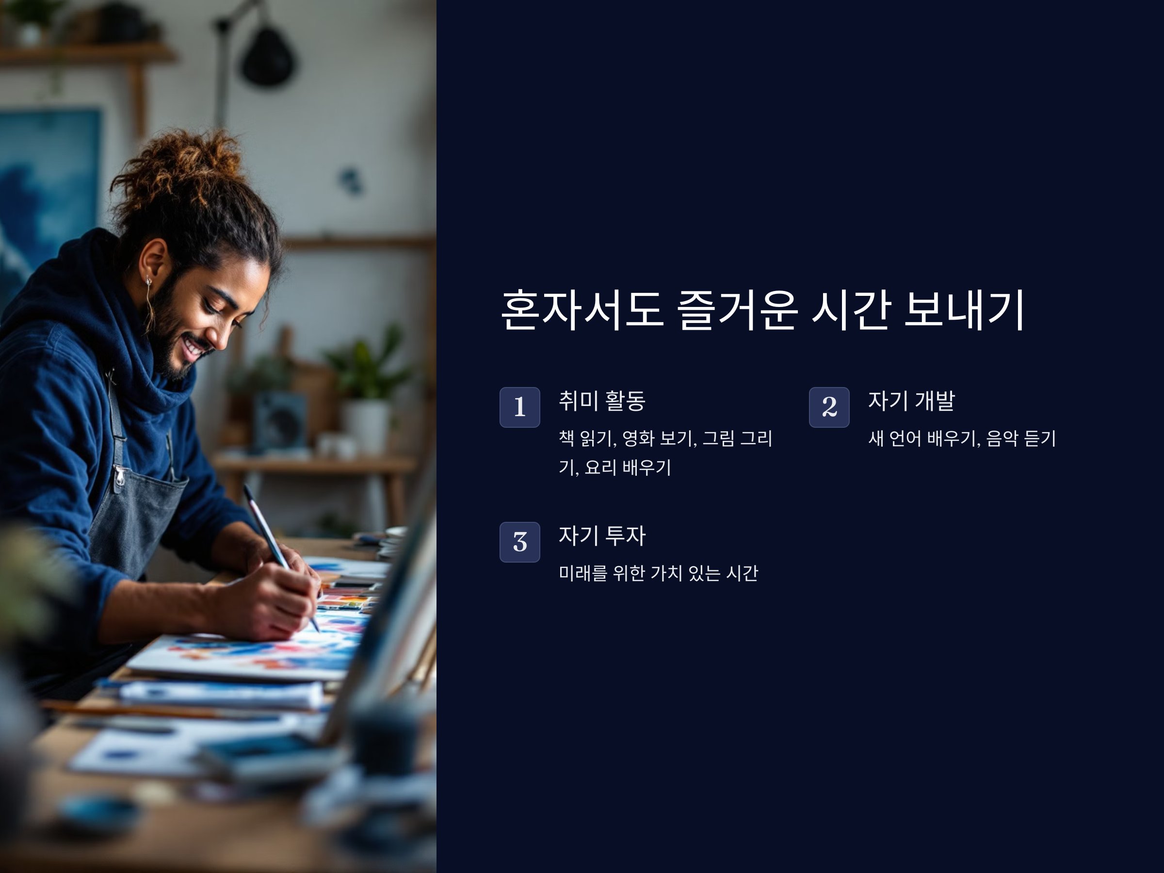 혼자 있는 시간이 길어지면, 처음에는 시간 가는 것도 힘들게 느껴질 수 있습니다. 하지만 시간이 지나면서 이 고독한 시간도 잘 활용하면 오히려 즐거운 경험이 될 수 있습니다. 책을 읽거나 영화, 드라마를 보는 것은 기본이죠. 그 외에도 자신만의 취미를 찾아서 그것에 몰두하는 것도 좋은 방법입니다. 예를 들어, 그림을 그리거나 요리를 배우는 것도 혼자 시간을 보내는 데 효과적입니다.