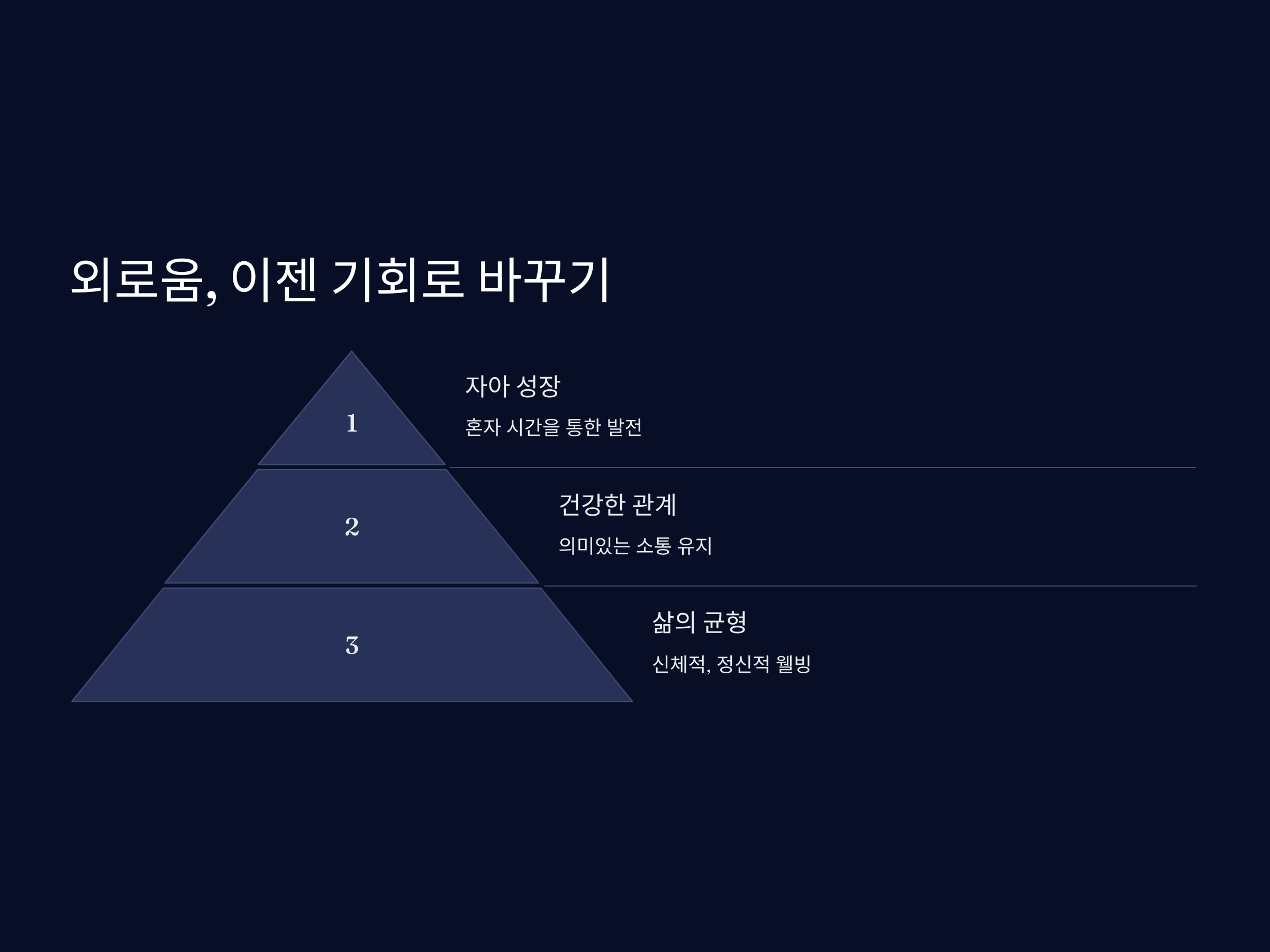 내면의 안정과 평화를 찾으면, 외로움이 자연스럽게 덜어지고 마음의 여유가 생깁니다. 이를 통해 더 나은 삶을 만들어갈 수 있는 길을 찾을 수 있습니다. 자신의 감정과 생각을 조절할 수 있는 능력은 장기적으로 자신에게 큰 도움이 될 것입니다. 심리적인 건강을 잘 유지하는 것만큼 중요한 일은 없습니다.
