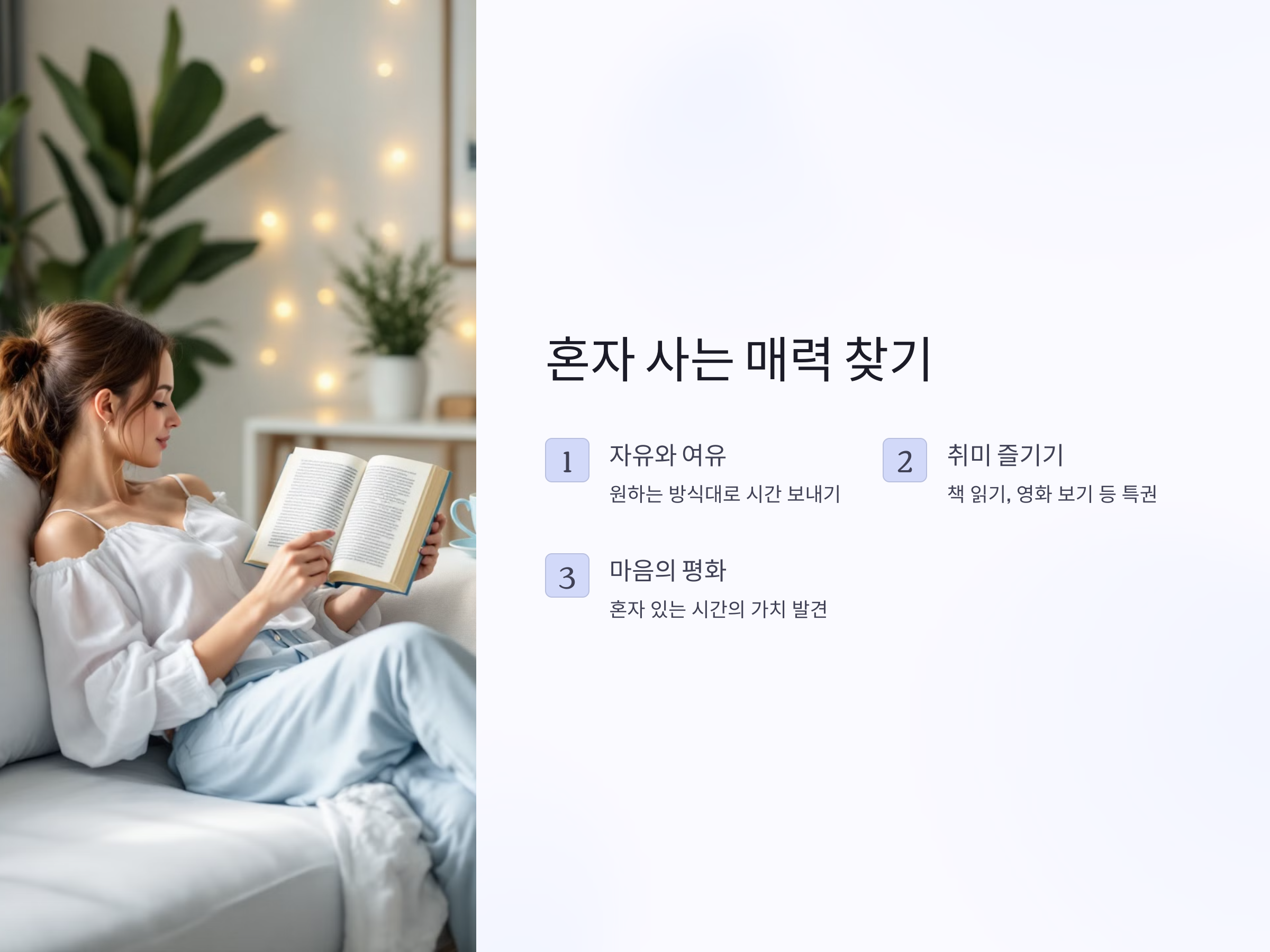 혼자 살게 되면 처음에는 많은 불안감과 외로움을 느낄 수 있습니다. 하지만 혼자 사는 생활에는 그만큼의 자유와 여유가 따릅니다. 자신만의 공간에서 원하는 방식대로 시간을 보내는 것만큼 매력적인 것이 없습니다. 예를 들어, 집에서 편안하게 책을 읽거나 영화나 드라마를 마음대로 볼 수 있는 것은 혼자 살면서만 누릴 수 있는 특권입니다.