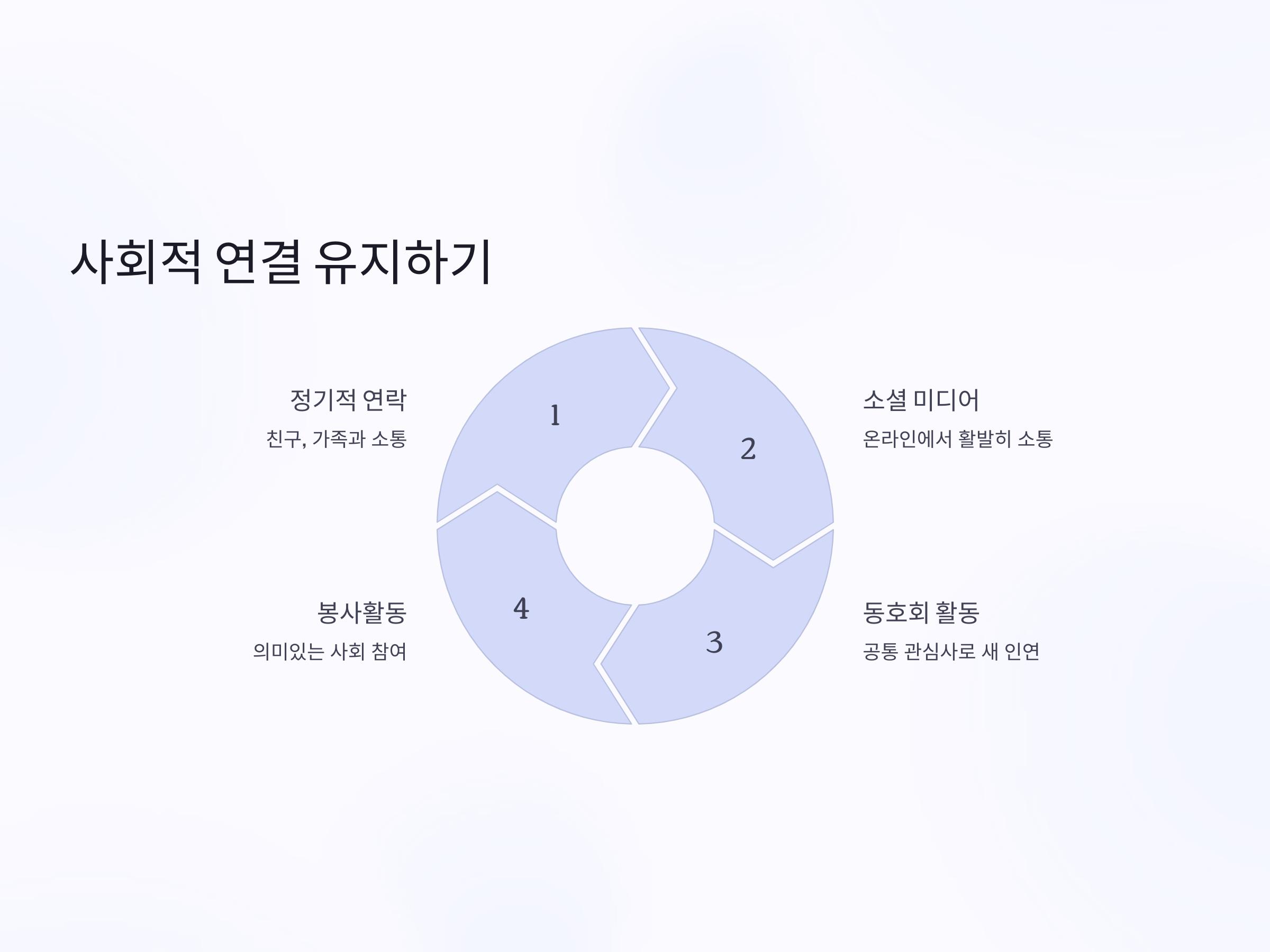 정기적인 연락을 통해 친밀감을 유지하고, 만날 시간을 예약하는 등의 방법도 좋습니다. 또한, 봉사활동이나 동호회 활동에 참여하면 새로운 사람들을 만나고, 공통의 관심사를 가진 사람들과의 만남을 통해 외로움을 해소할 수 있습니다. 사회적 연결을 유지하는 것은 외로움을 줄이는 가장 효과적인 방법 중 하나입니다.