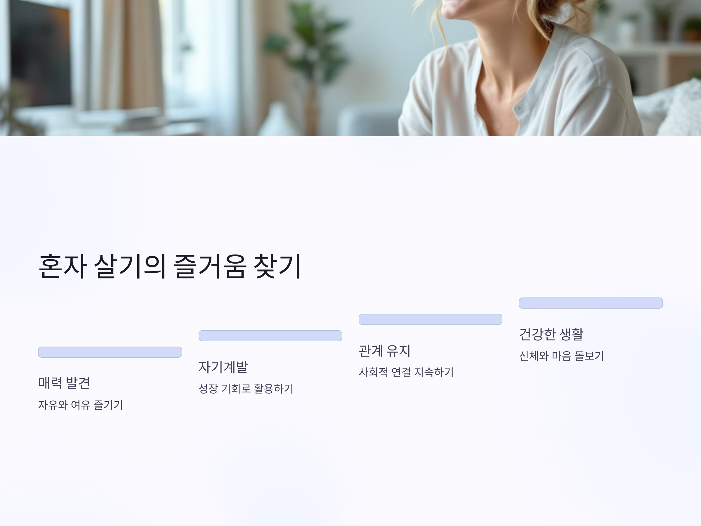 혼자 살면서 외로움을 극복하는 방법은 나만의 시간을 잘 보내고, 적극적으로 사회적 관계를 유지하는 데 있습니다. 일상 속에서 작은 변화를 주고, 자신에게 집중할 수 있는 방법들을 찾으면 혼자 있는 시간도 더 즐겁고 의미있게 보낼 수 있습니다. 그럼, 혼자 사는 동안 외로움을 덜 느끼고 더 만족스럽게 지낼 수 있는 방법을 함께 살펴볼까요?