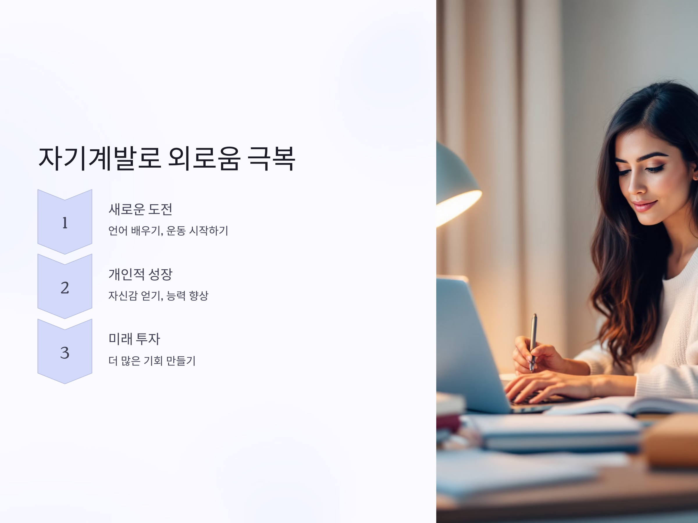 자기계발은 개인적인 성장 뿐만 아니라, 미래를 위한 투자이기도 합니다. 자기계발에 집중하다 보면 외로움을 잊을 수 있으며, 자신의 능력과 가능성에 대해 자신감을 얻을 수 있습니다. 또한, 이를 통해 더 많은 기회를 만들어갈 수 있는 장점도 있습니다. 이처럼 혼자 있을 때 자신에게 유익한 일을 찾아 도전하는 것이 외로움에서 벗어나는 좋은 방법입니다.