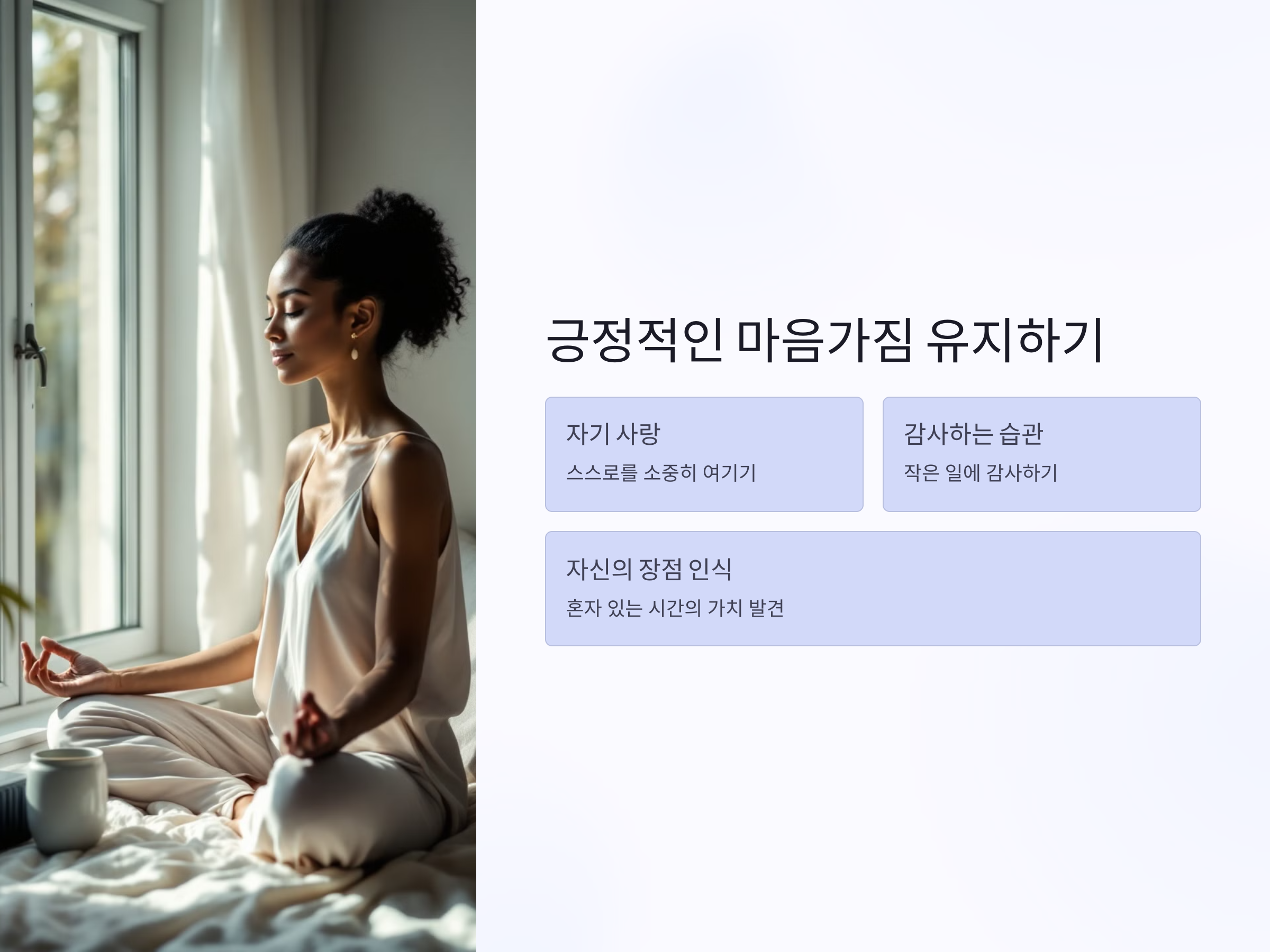 긍정적인 마인드를 유지하려면, 작은 일에 감사하는 습관을 들이고, 자신의 장점을 인식하는 것이 필요합니다. 이를 통해 외로움이 찾아오더라도 그 속에서 자신만의 행복을 찾을 수 있습니다.