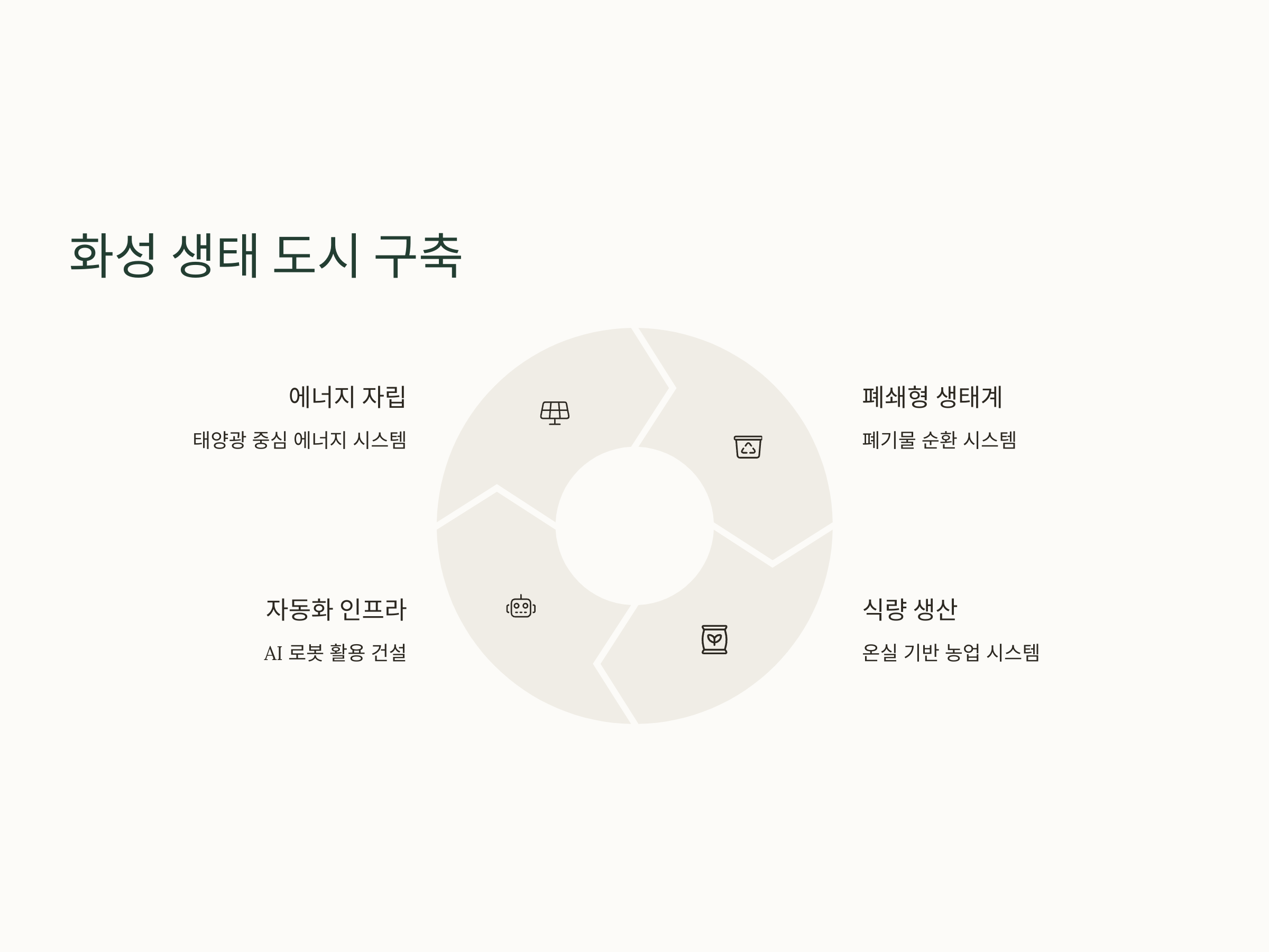 단순한 기지 수준이 아닌 도시를 만든다는 머스크의 구상은 생태적 자급자족을 중심으로 합니다. 주요 요소는 다음과 같습니다. 1) 태양광을 중심으로 한 에너지 자립, 2) 폐기물 순환을 포함한 폐쇄형 생태 시스템, 3) 온실을 이용한 식량 생산, 4) 극저온을 견디는 방열복 및 주거 기술 등입니다.