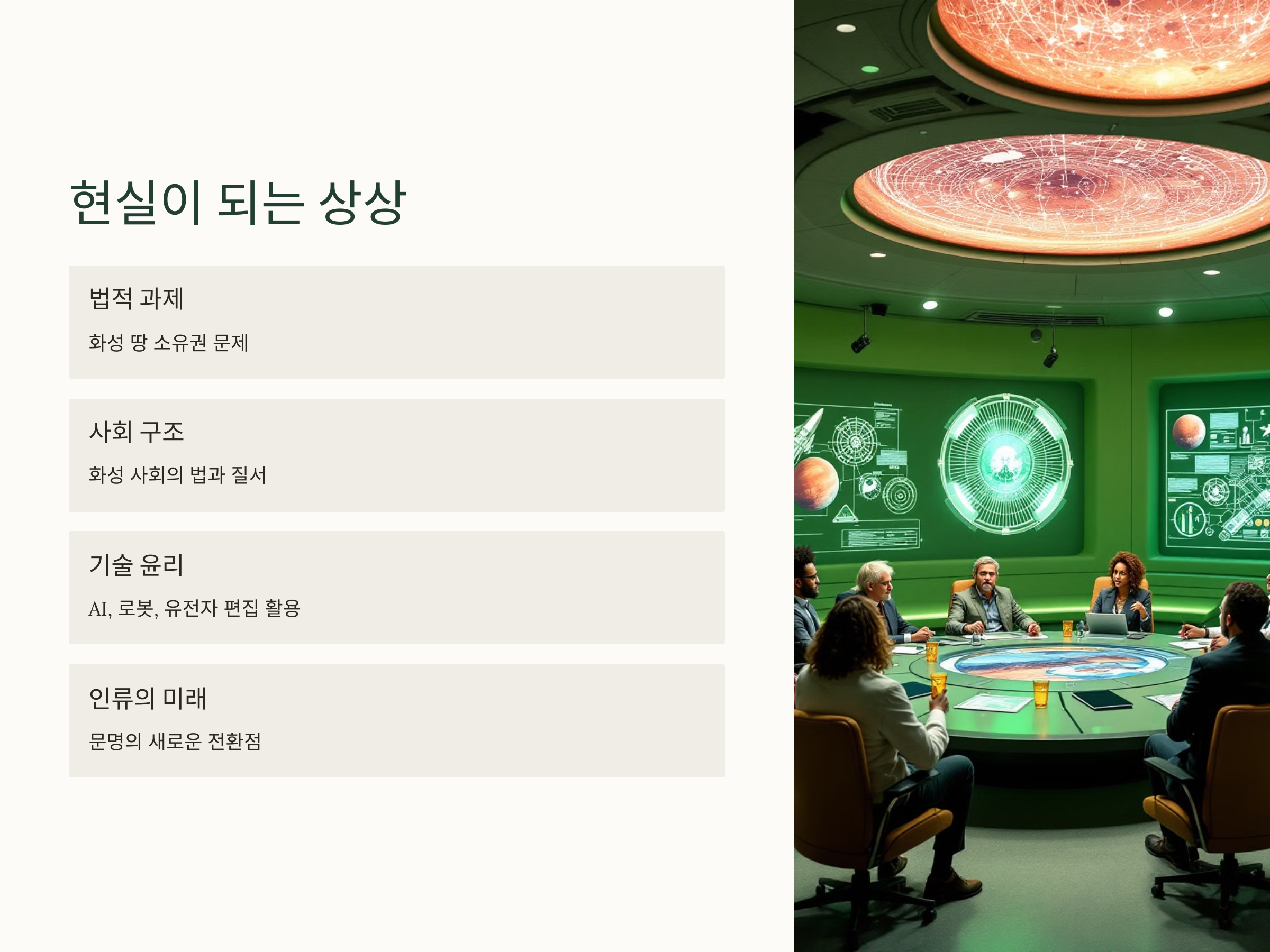 머스크의 비전이 현실화되고 있는 지금, 우리가 준비해야 할 것은 기술뿐만 아니라 철학적, 윤리적 관점입니다. 누가 먼저 화성 땅을 소유하게 될 것인가? 화성 사회의 법은 어떤 기준으로 정해질 것인가? 인공지능, 로봇, 유전자 편집 등의 기술이 함께 동반되는 우주 사회의 구성원으로서 우리는 어떤 방향으로 나아가야 할까?