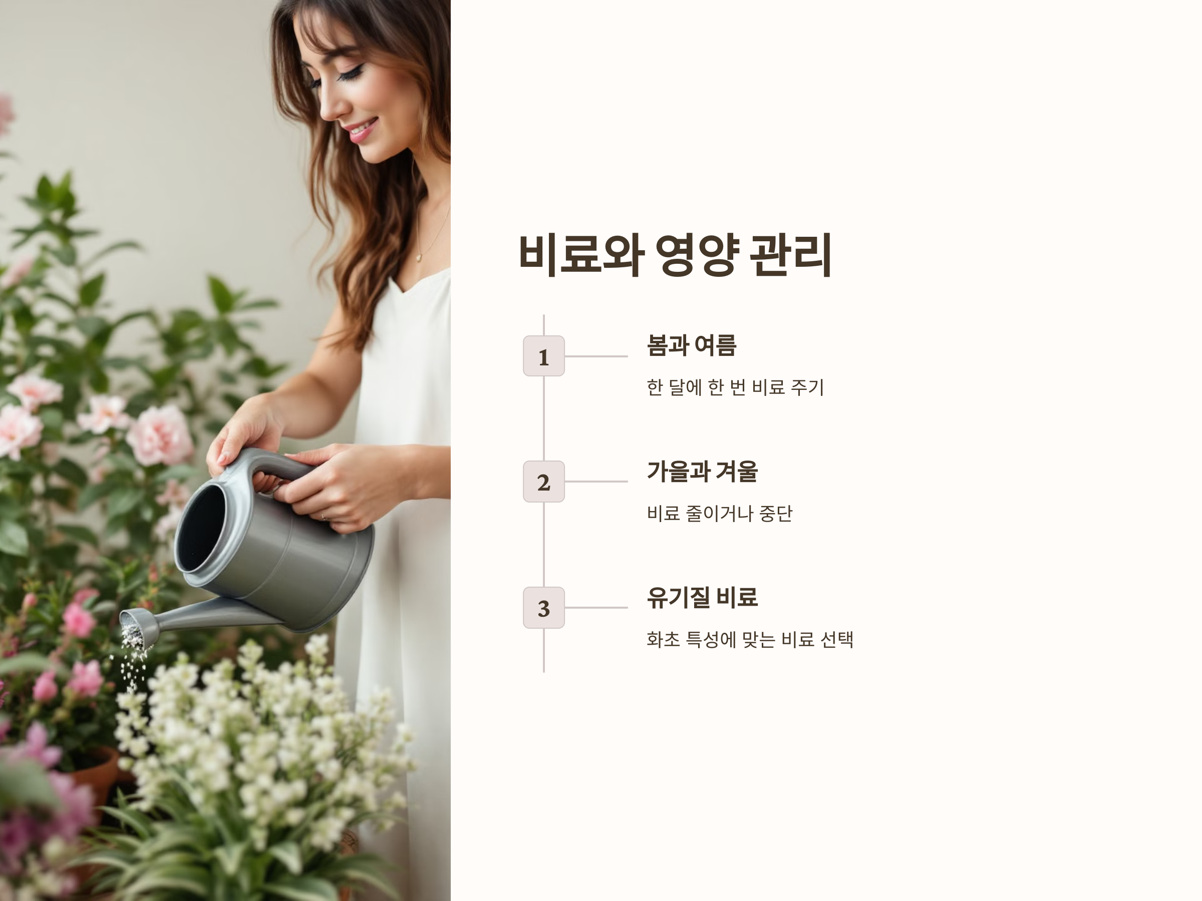 - 유기질 비료: 화초의 특성에 맞는 유기질 비료를 사용하는 것이 좋습니다. 화초마다 필요한 영양소가 다르기 때문에, 비료 선택에 신경을 써야 합니다.