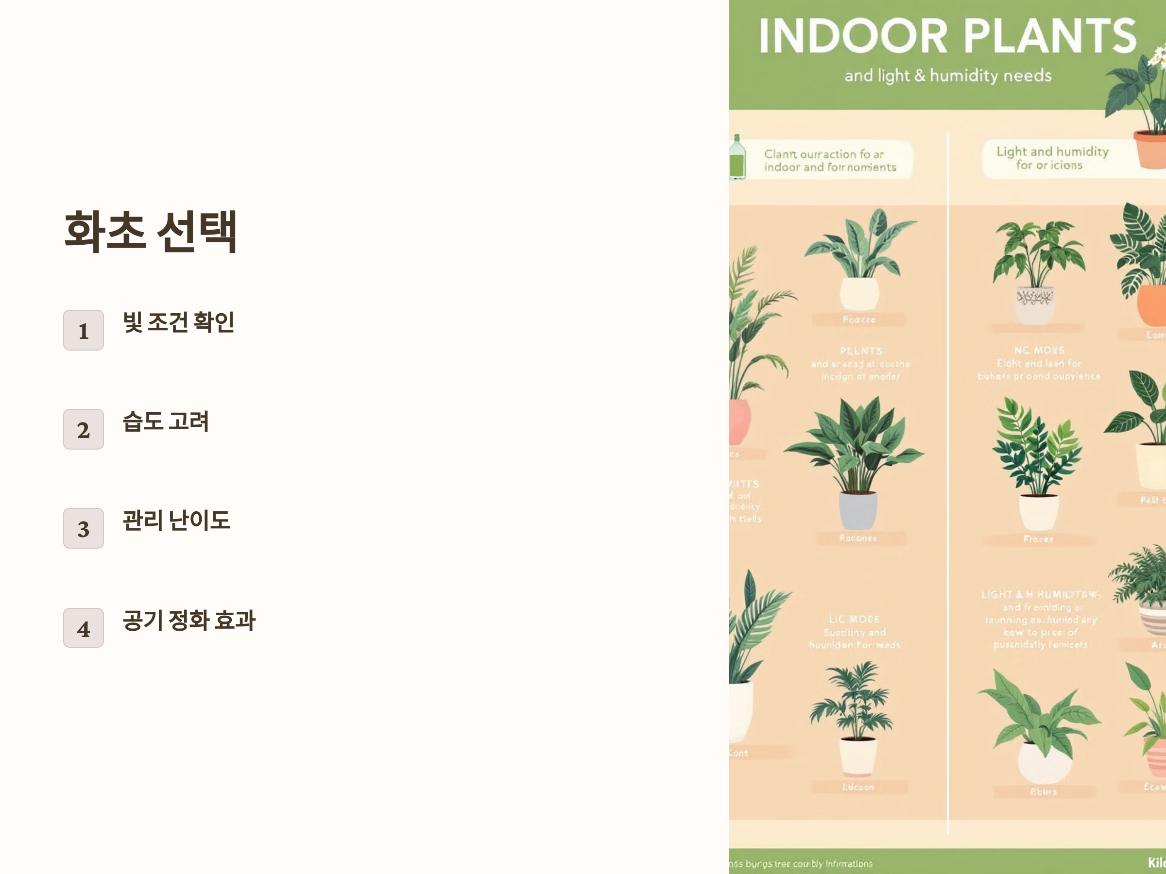 - 빛 조건 확인: 화초가 필요로 하는 빛의 양을 파악하세요. 직사광선이 필요한 식물도 있고, 그늘에서도 잘 자라는 식물도 있습니다.