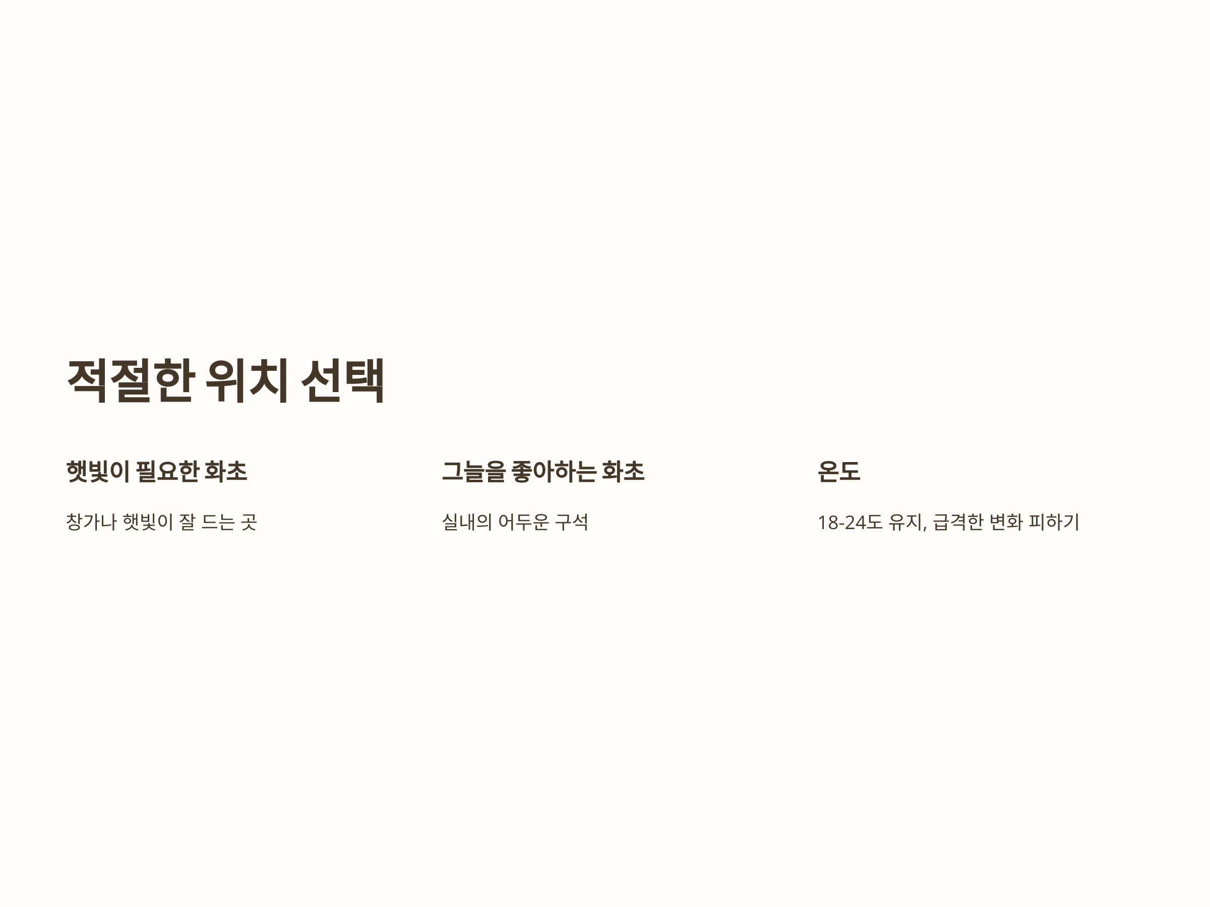 화초가 자라기에 가장 중요한 요소는 바로 위치입니다. 빛이 충분히 들어오는 곳에 두는 것이 가장 기본적인 사항입니다.