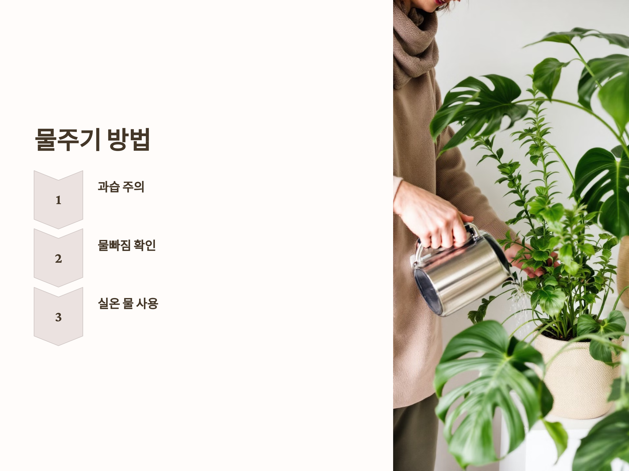 - 물의 온도: 찬물보다는 실온의 물을 주는 것이 좋습니다. 찬물이 뿌리에 스트레스를 줄 수 있기 때문에 온도에 신경을 써 주세요.
