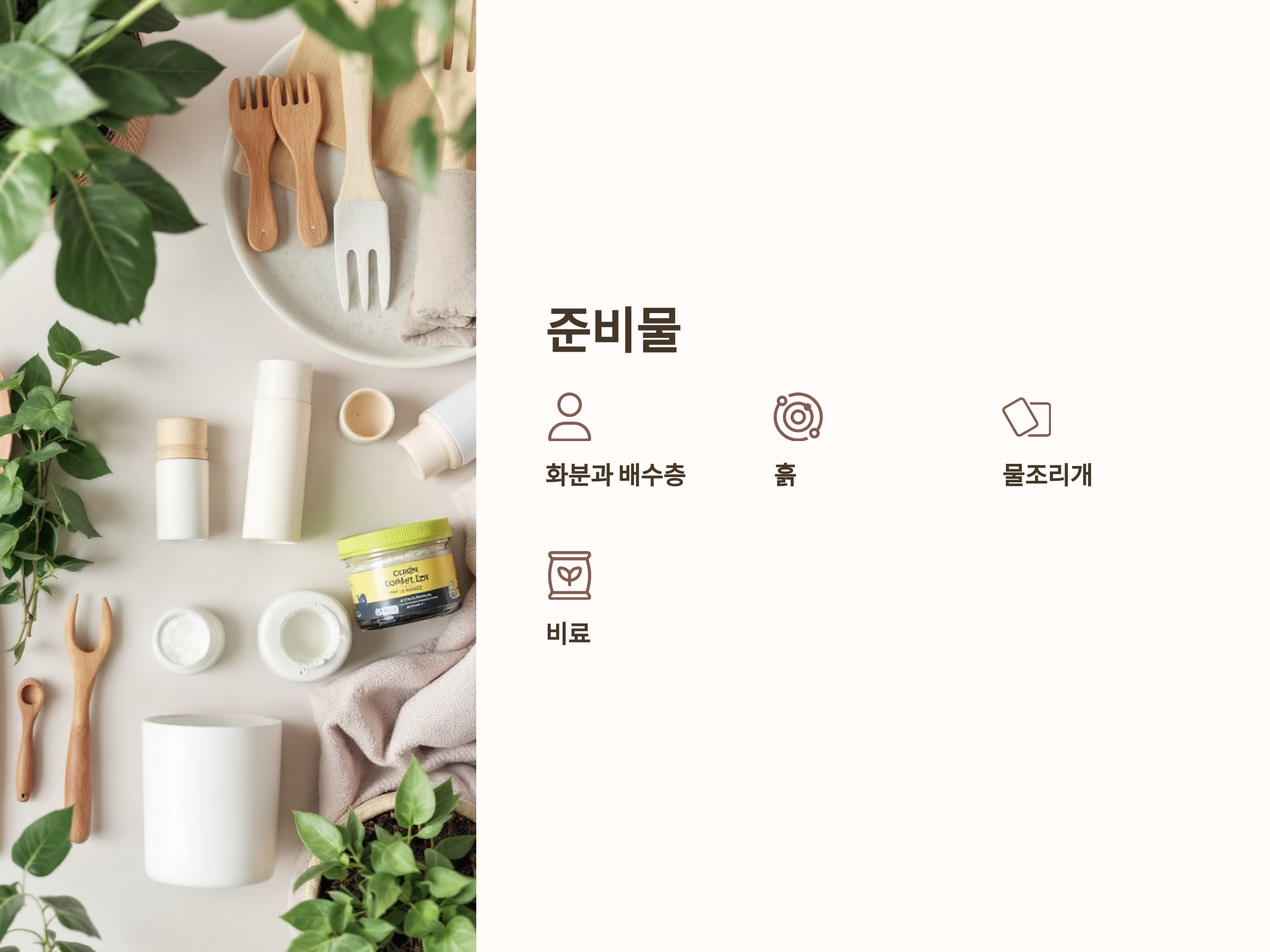 - 화분과 배수층: 화분은 식물의 뿌리가 잘 자랄 수 있도록 적당한 크기와 배수구멍이 있는 것이 중요합니다. 배수층을 깔아 물빠짐을 좋게 만들어 주세요.