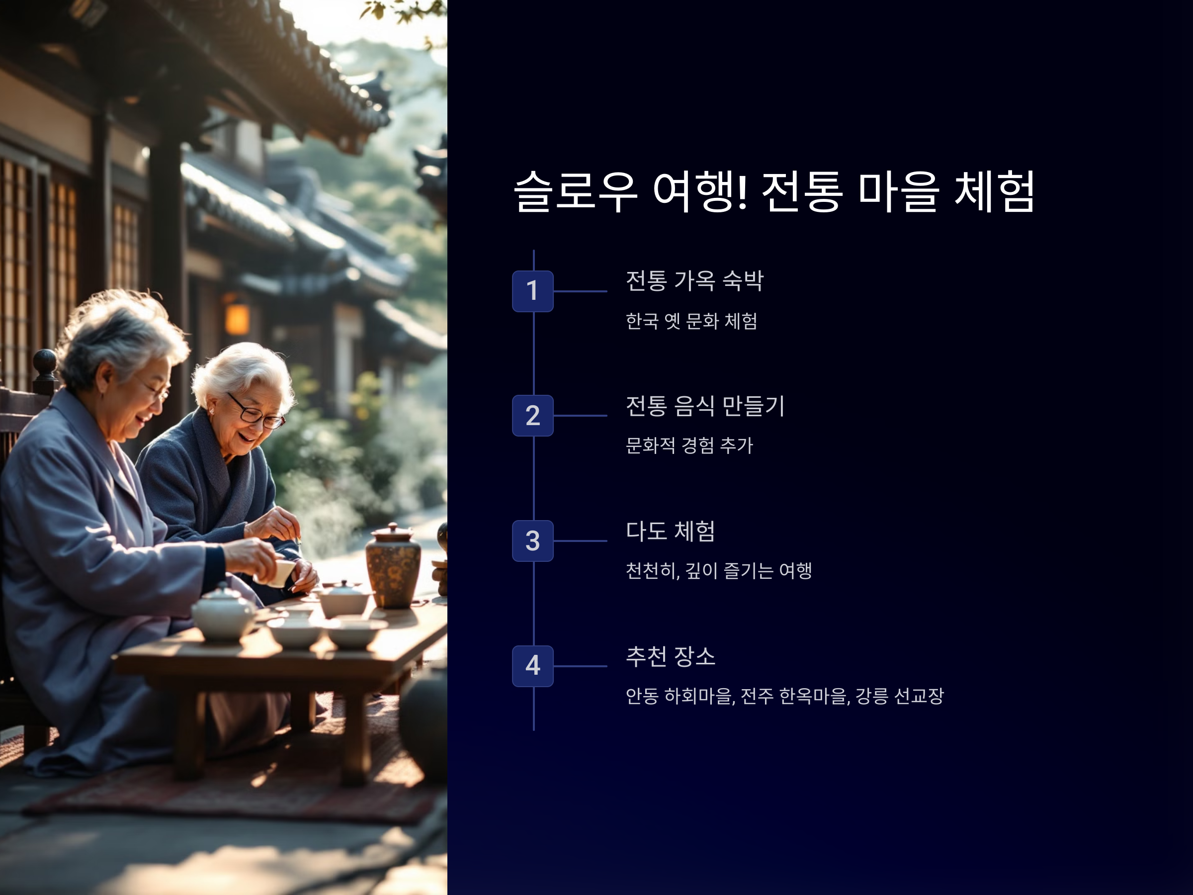 빠른 일정의 여행보다 여유롭게 전통을 체험하는 슬로우 여행은 노년층에게 적합한 여행 스타일입니다.