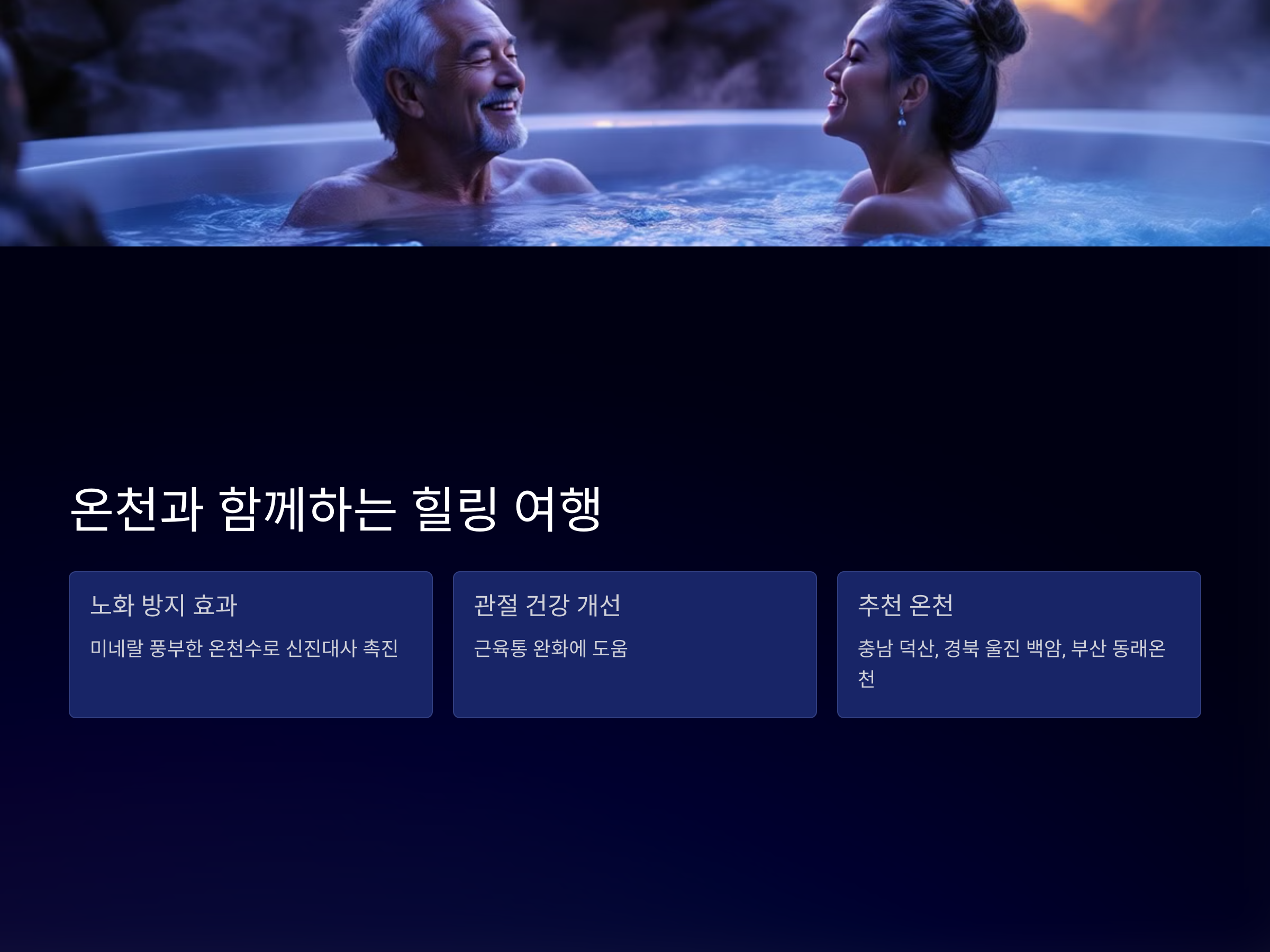 온천 여행은 노화 방지와 관절 건강에 탁월한 효과가 있는 대표적인 웰빙 여행입니다. 미네랄이 풍부한 온천수는 신진대사를 촉진하고 근육통을 완화하는 데 도움이 됩니다.