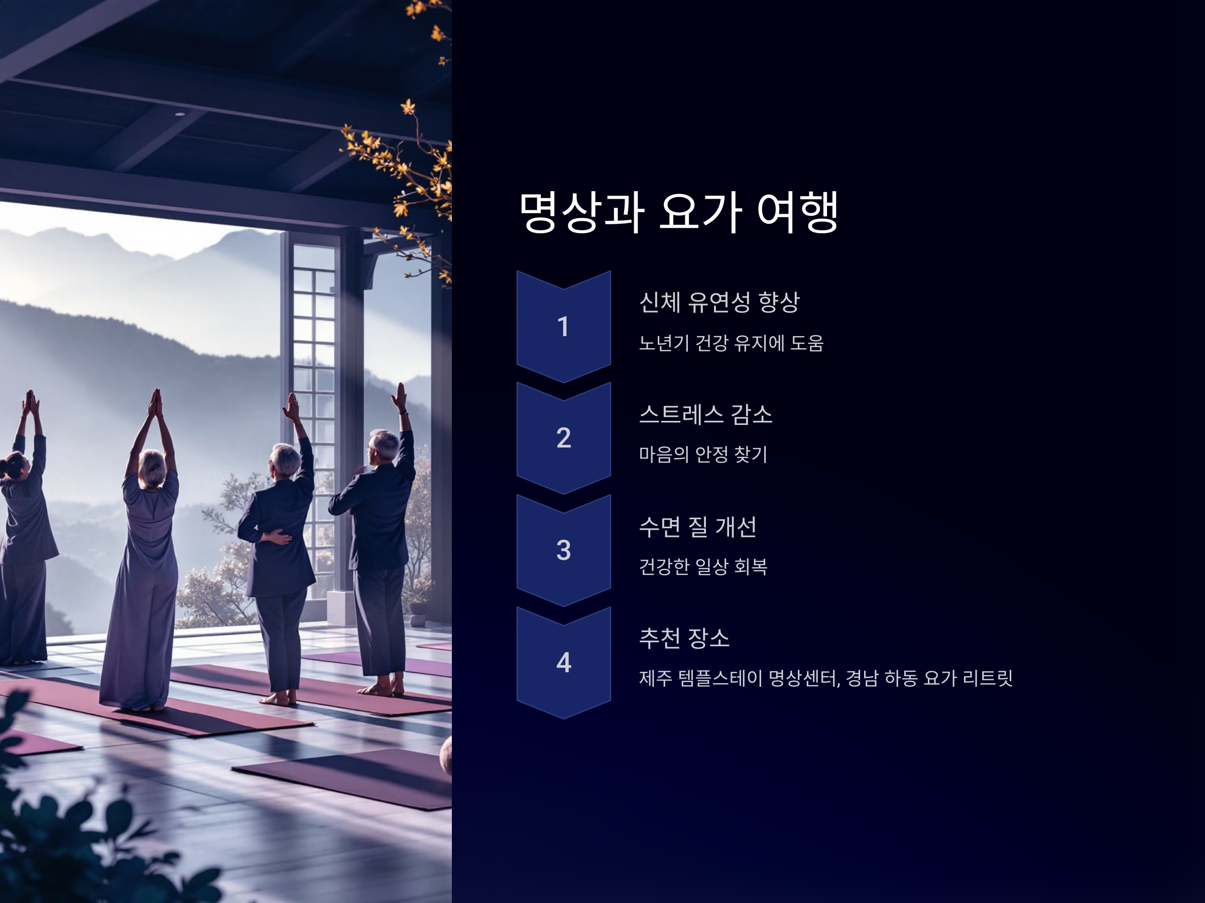 제주의 ‘템플스테이 명상센터’나 경남 하동의 ‘요가 리트릿 센터’ 등에서는 자연 속에서 명상과 요가를 경험할 수 있는 프로그램을 제공합니다. 특히 스트레스를 줄이고 수면의 질을 높이는 데 효과적인 프로그램이 마련되어 있어 노년층에게 좋은 선택지가 될 수 있습니다.