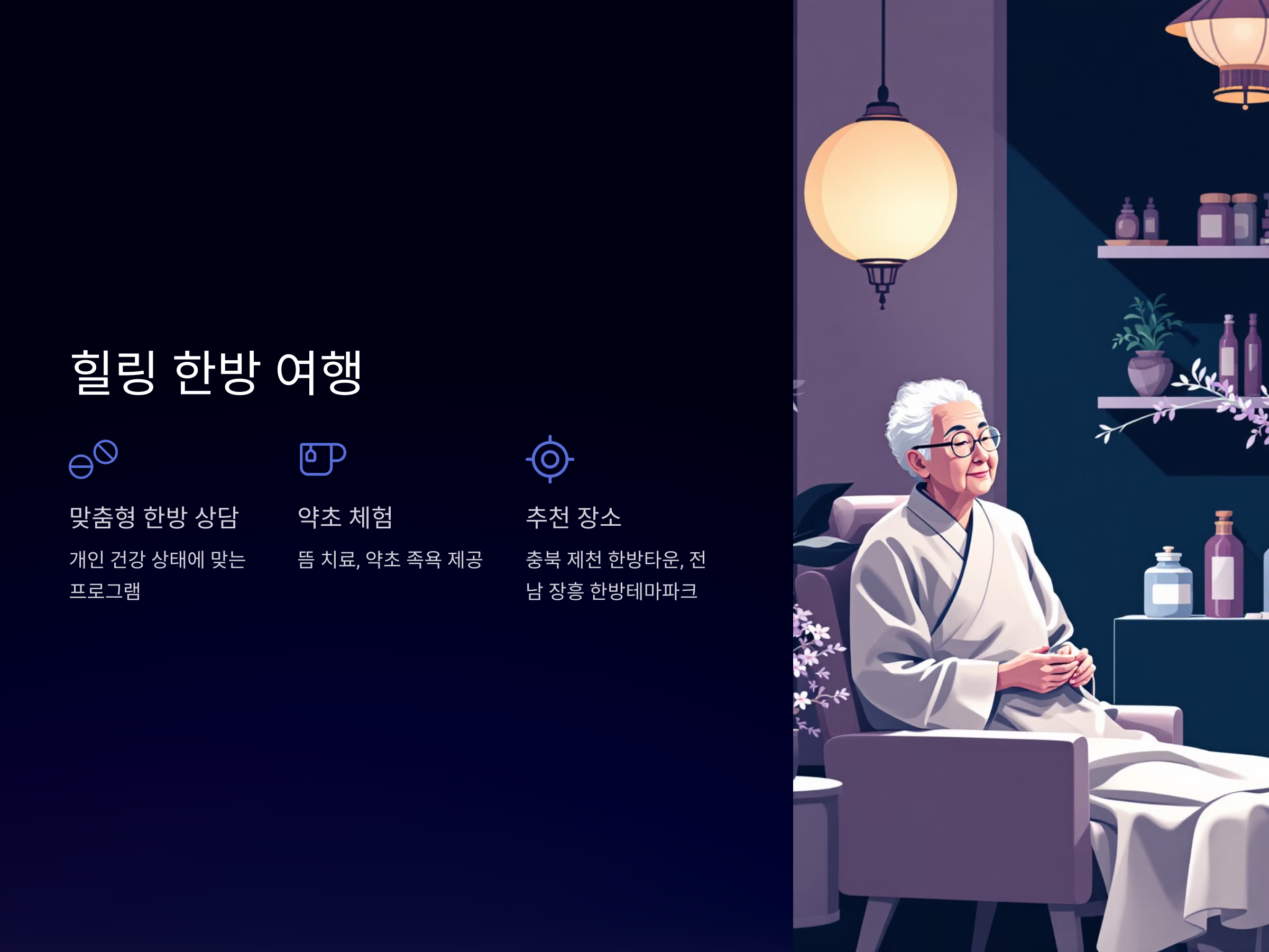 한방 여행은 한의학을 기반으로 한 웰빙 프로그램을 포함한 여행으로, 노년층에게 매우 유익한 여행 유형입니다. 대표적인 한방 관광지는 충북 제천의 한방 웰빙 타운과 전남 장흥의 한방 테마파크가 있습니다.