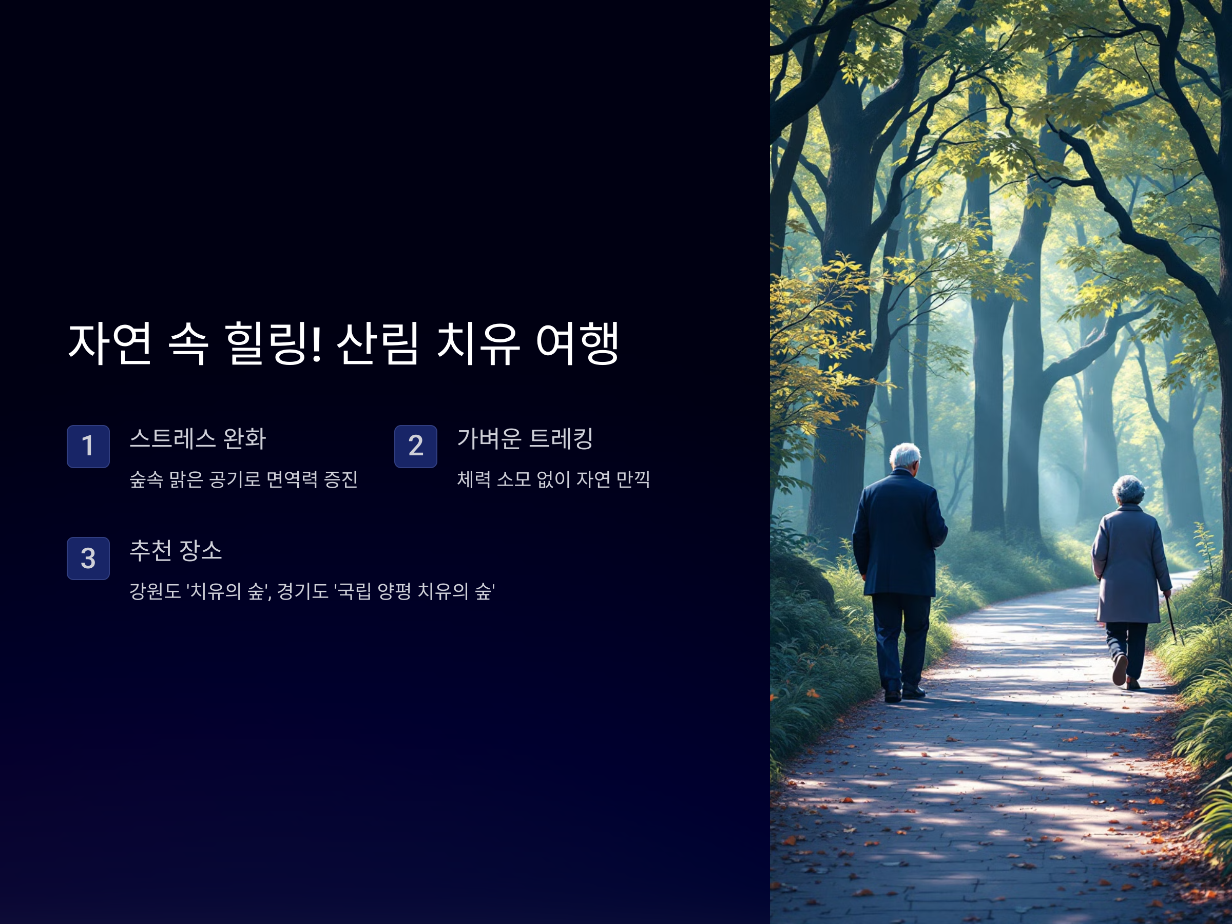 산림 치유 여행은 숲속에서 맑은 공기를 마시며 신체와 마음을 치유하는 프로그램입니다. 숲은 스트레스 완화와 면역력 증진에 도움을 주며, 가벼운 트레킹과 산책 코스를 활용하면 체력 소모 없이 자연을 만끽할 수 있습니다.