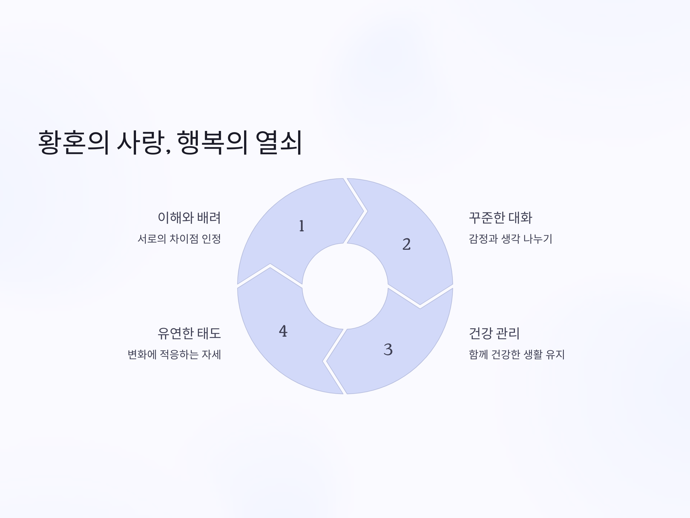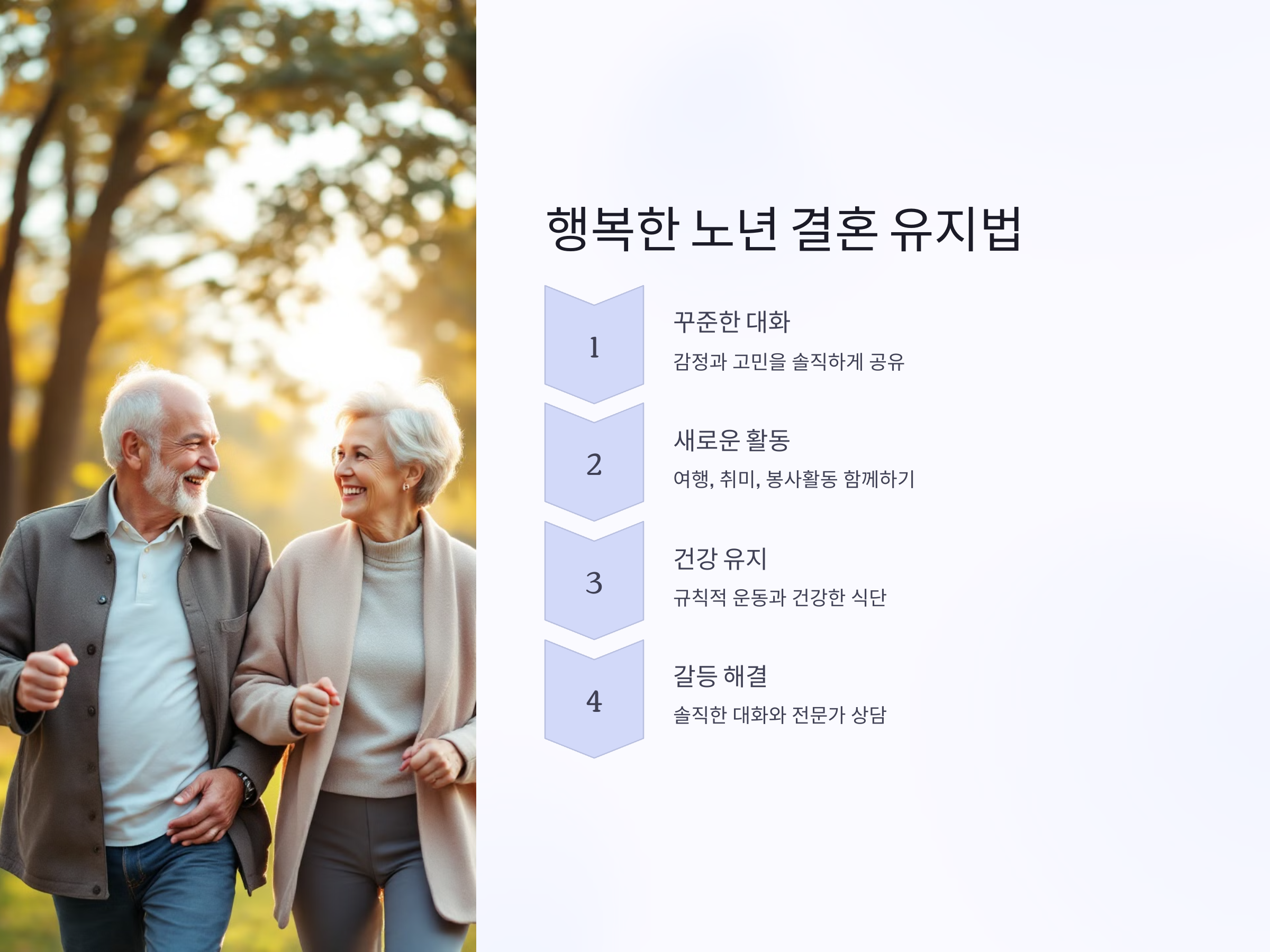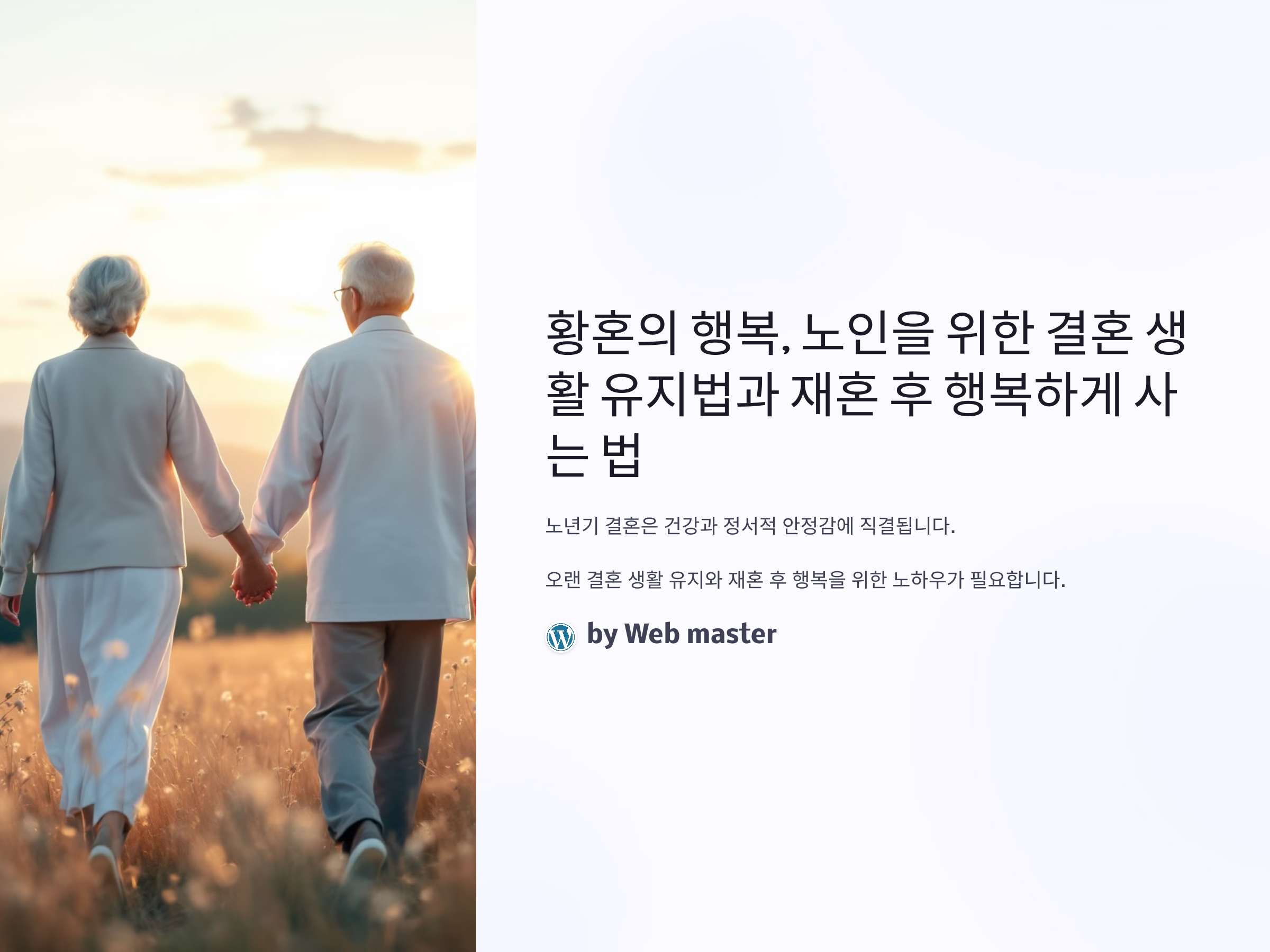 결국 노년기 결혼과 재혼의 행복은 서로를 이해하고 배려하는 데서 출발합니다. 대화, 건강, 신뢰, 유연한 태도를 유지하면서 긍정적인 관계를 쌓아가는 것이 가장 중요합니다.