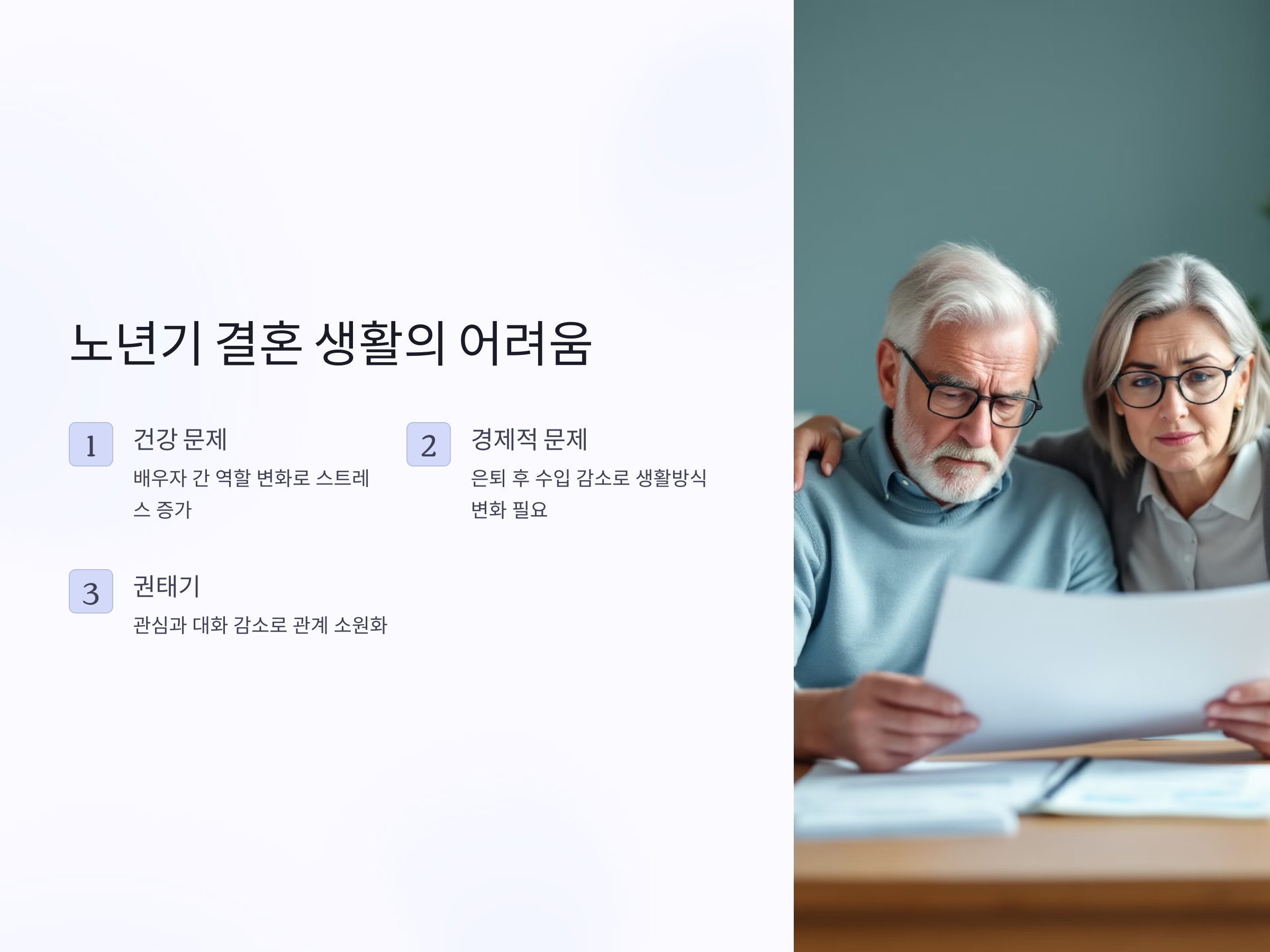 둘째, 경제적인 문제도 중요한 요인입니다. 은퇴 후 수입이 줄어들면서 생활 방식의 변화가 필요하지만, 이에 대한 합의가 쉽지 않을 수 있습니다. 금전적인 문제로 인해 갈등이 발생하면, 결혼 생활의 만족도가 크게 떨어질 수 있습니다.