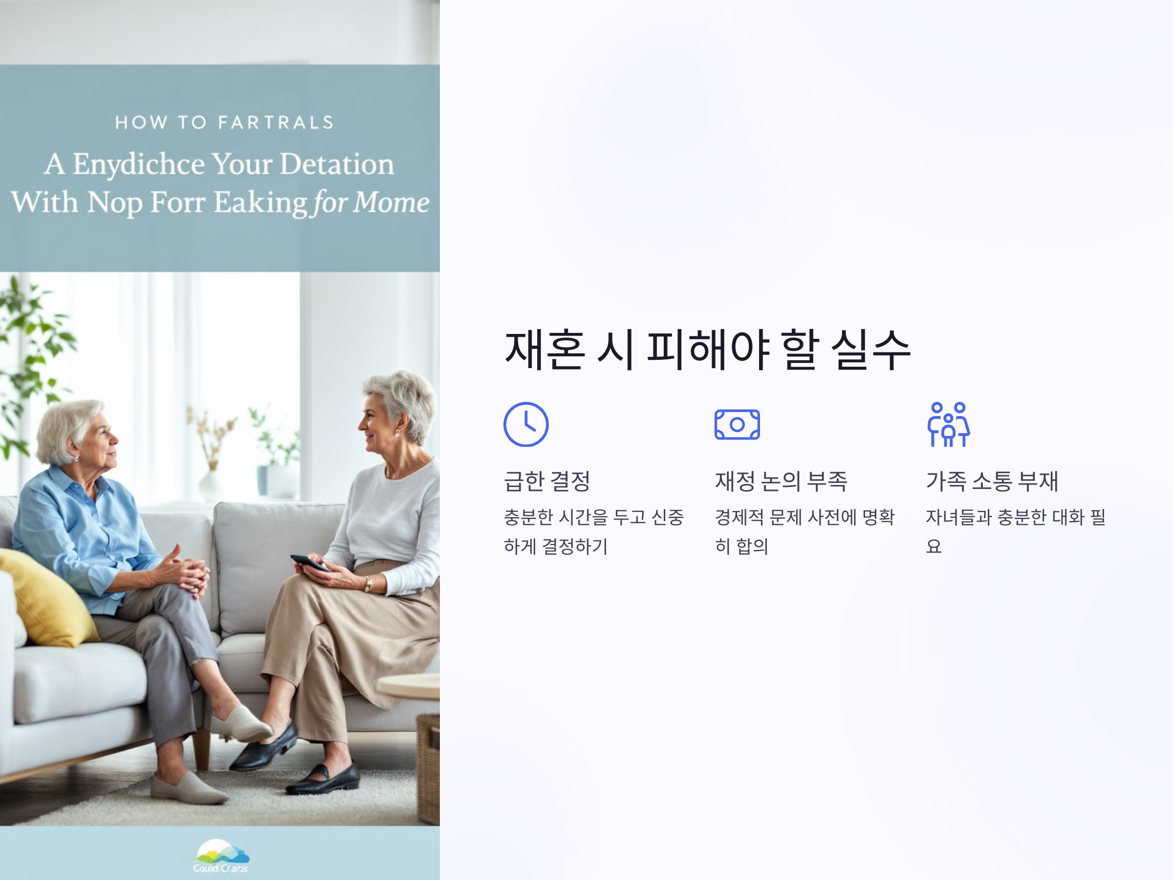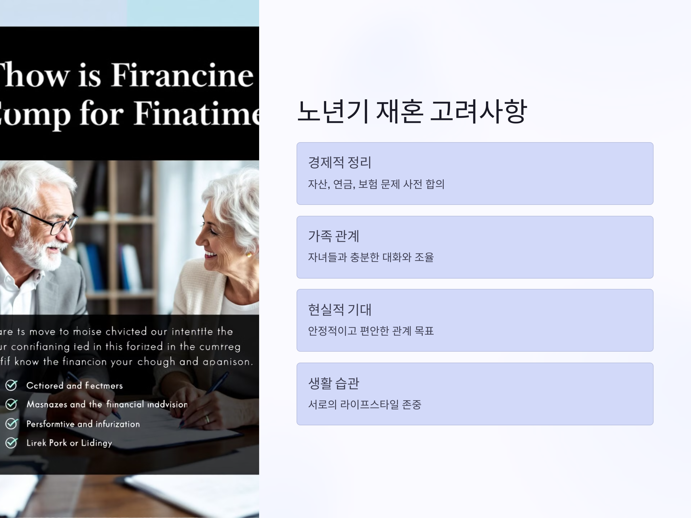 노년기의 재혼은 젊을 때와는 다른 요소를 고려해야 합니다. 첫째, 경제적인 부분을 명확하게 정리해야 합니다. 서로의 자산, 연금, 보험 문제를 사전에 충분히 논의하고 합의하는 것이 중요합니다.