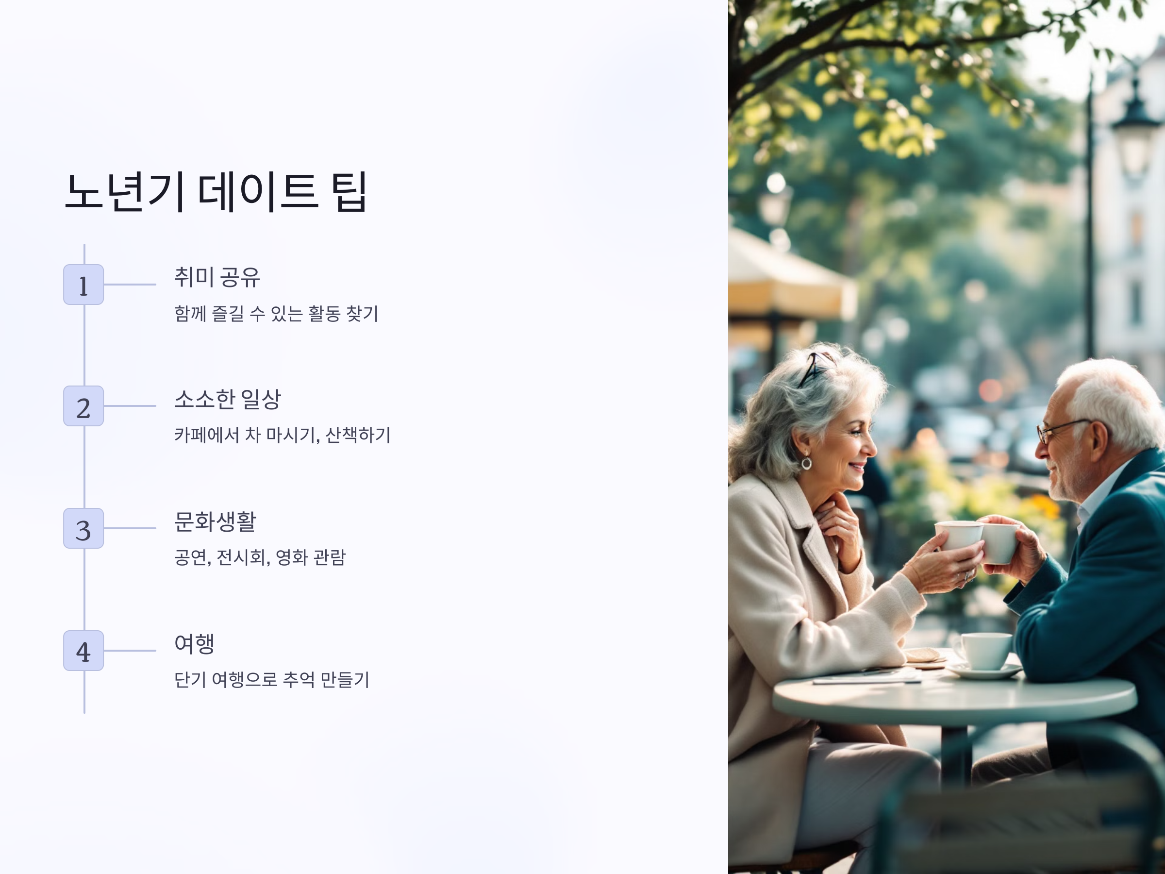 셋째, 기대치를 현실적으로 설정해야 합니다. 젊을 때와 같은 열정적인 사랑보다는 안정적이고 편안한 관계를 목표로 하는 것이 좋습니다.